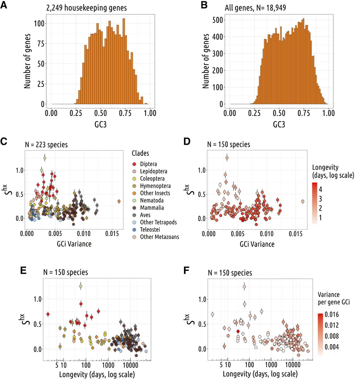 Impact of intra-genomic variability in neutral substitution patterns on TS. (A) Distribution of GC3 across human housekeeping genes (identified based on gene expression data from 27 healthy tissues, extracted from Pouyet et al. 2017). (B) Distribution of GC content at the third position of codons (GC3) across all human genes. (C,D) Relation between TS intensity Shx and the gene GCi variance. (D) Species are colored with a longevity gradient (log scale). (E,F) Relation between TS intensity Shx and longevity (days). (F) Species are colored with a GC intron variance gradient (log scale; N = 223 species).