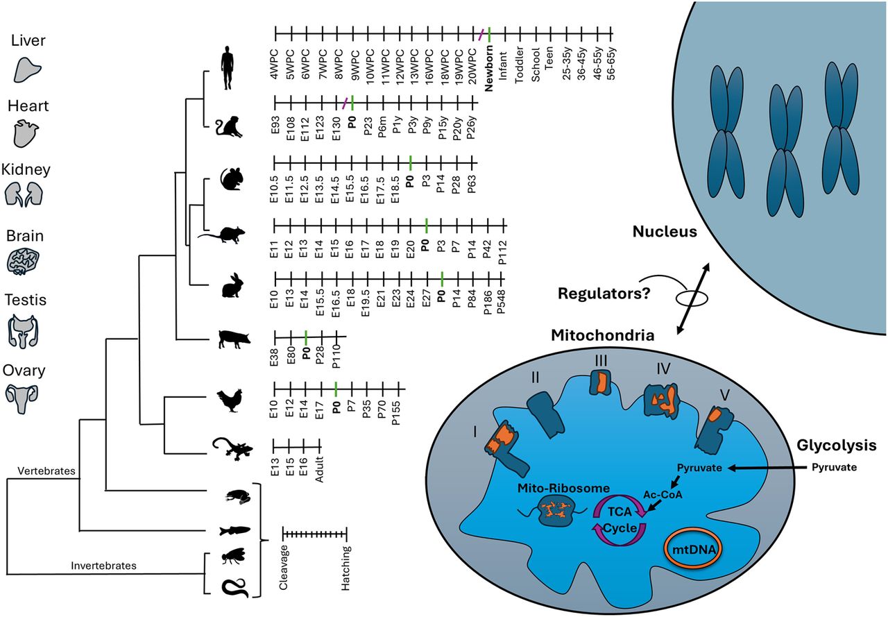 Roadmap to assessment of mitonuclear gene expression (RNA-seq) during the course of development and evolution. Tissues analyzed (indicated) were collected from six mammals (Homo sapiens, Macaca mulatta, Mus musculus, Rattus norvegicus, Oryctolagus cuniculus), as well as from Gallus gallus (chicken), during development. The developmental stages are indicated per organism, and P0 (birth/hatching) is highlighted for mammals and birds. Missing stages (owing to lack of samples) are indicated by “/.” To avoid sample size issues, gene expression in Anolis carolinensis (brain, heart, kidney, liver) was compared between a group of embryonic versus adult samples (e.g., not divided into further stages). Analysis of additional nonmammalian vertebrates, for example, Xenopus tropicalis (tropical frog) and Danio rerio (zebrafish), as well as two invertebrates, for example, Drosophila melanogaster and Caenorhabditis elegans, was limited to the prenatal stages. mtDNA and nuclear DNA–encoded subunits of OXPHOS complexes I, III, IV, and V are indicated in orange and dark blue, respectively. Additional selected metabolic pathways are indicated, including the mitochondrial ribosome (mito-ribosome), tricarboxylic acid cycle (TCA), and glycolysis. The lack of knowledge of regulators of mitonuclear gene expression is indicated.