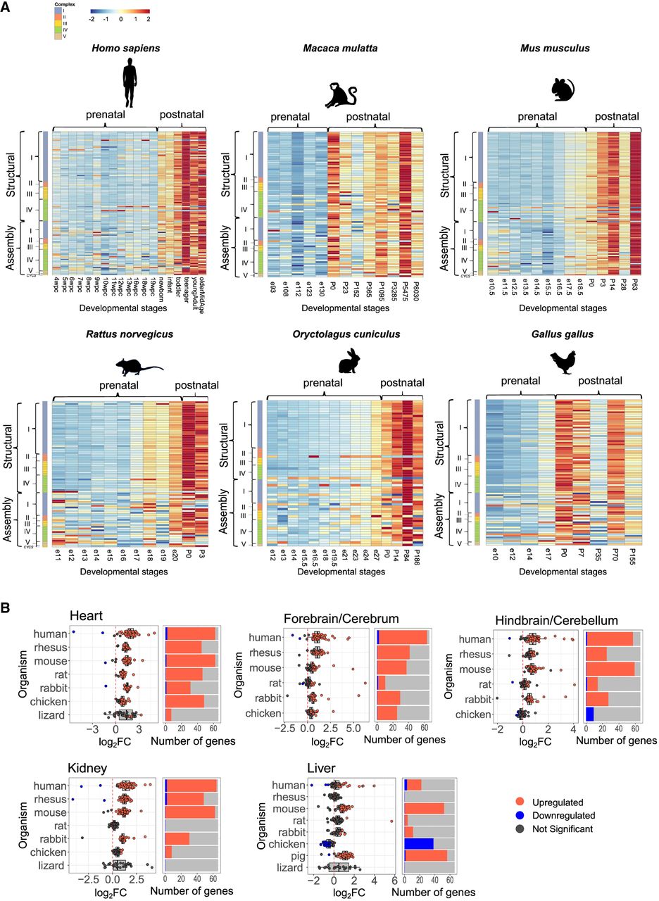 Nuclear DNA-encoded OXPHOS genes expression is elevated after birth/hatching across vertebrates. (A) Heatmaps representing expression of nuclear DNA-encoded OXPHOS gene in the heart from five mammals and in birds. Color bar: red scale indicates elevated expression; blue scale, reduced expression. Above each panel are the labels of the prenatal and postnatal samples. The x-axis indicates developmental stages; y-axis, nuclear DNA-encoded genes, divided according to OXPHOS complexes, structural and assembly genes, and Cytochrome C (CYCS). (B, left) Box plots indicating the log2FC of nuclear DNA-encoded structural subunits of the OXPHOS. The x-axis indicates Log2FC; y-axis, the tested organisms. Color bar: blue dots indicate downregulation (log2FC < −0.2, P-value < 0.05); red dots, upregulation (log2FC > 0.2, P-value < 0.05); and gray dots, nonsignificant. Dashed vertical red line displays the value of zero log2FC on the x-axis. (Right) Bar plots representing the number of significant (indicated in red or blue) and nonsignificant (NS) nuclear OXPHOS genes expression (colored in gray). Blue indicates statistically significant genes with decreased expression between the time points (P < 0.05); red, number of genes with significantly increased expression. The x-axis indicates number of genes; y-axis, organisms.