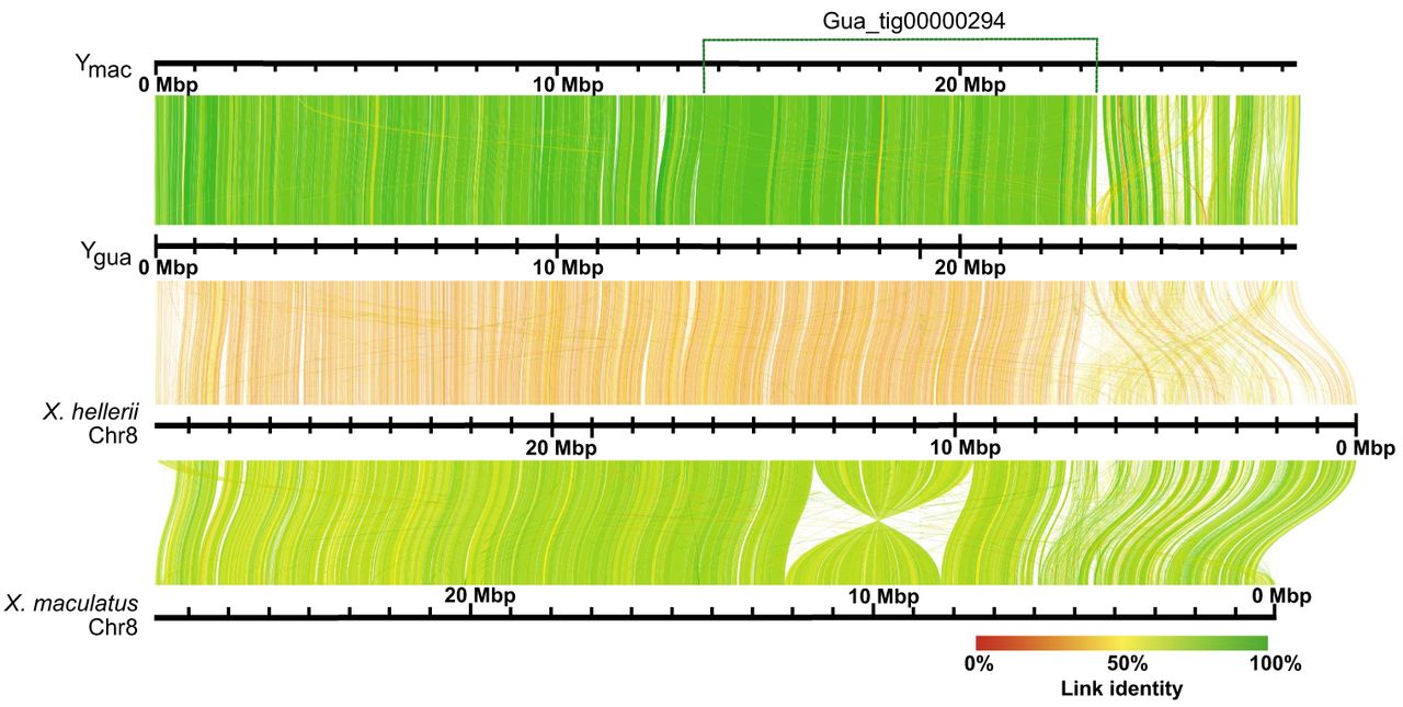 Alignment of Ygua and Ymac haplotypes to Xiphophorus Chromosome 8. A 3.5 Mb inversion distinguishes X. hellerii and X. maculatus. The position of the long contig Gua_tig00000294 that spans the inversion of X. maculatus Chr 8 is indicated at the top. The position of a short proximal sequence of the guppy Y also conforms to X. hellerii Chr 8, whereas it is translocated to the chromosome end in X. maculatus. Ygua and Ymac conform to one another and to X. hellerii Chr 8, with most divergence seen from 23 Mb to the end of guppy Y haplotypes.