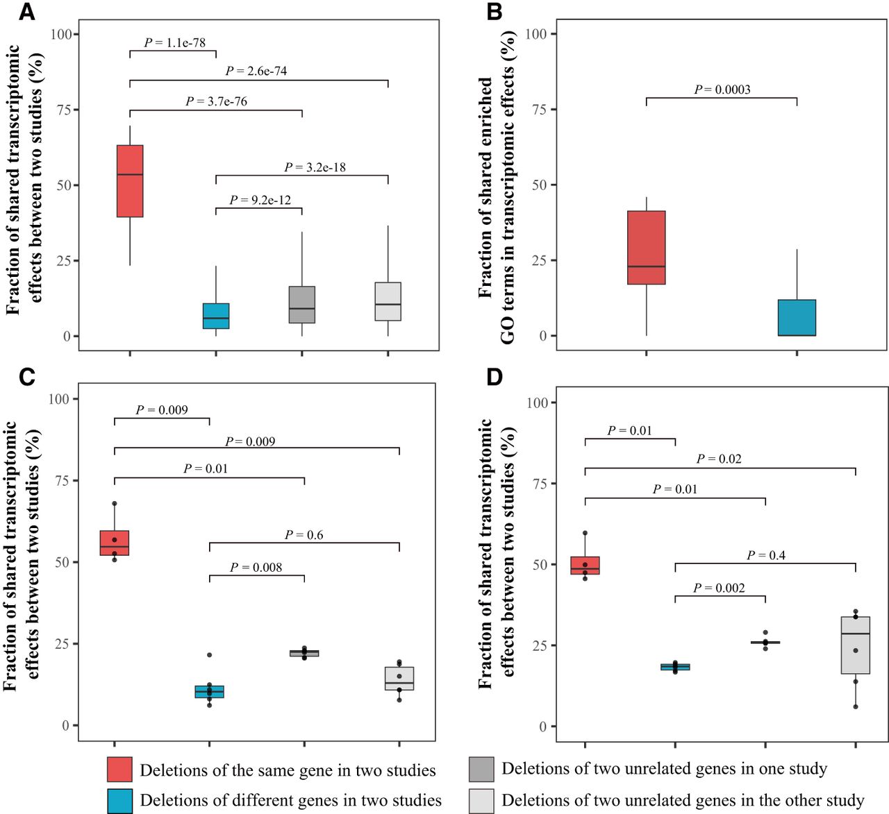 Comparison of the transcriptomic effects of budding yeast gene deletions detected in different studies. (A) Fraction of shared transcriptomic effects of Sce gene deletions between two microarray-based studies: Kemmeren et al. (2014) and Hu et al. (2007). (B) Fraction of shared enriched GO terms of transcriptomic effects between the above two studies. (C) Fraction of shared transcriptomic effects of four gene deletions (HAP2, HAP3, HAP4, and HAP5) between two microarray-based studies (Hu et al. 2007; Kemmeren et al. 2014). (D) Fraction of shared transcriptomic effects of the same four gene deletions between a microarray study (Kemmeren et al. 2014) and an RNA-seq study (Liu et al. 2020). (C,D) Each dot represents one comparison. In each panel, the lower and upper edges of a box represent the first (qu1) and third (qu3) quartiles, respectively; the horizontal line inside the box indicates the median (md); and the whiskers extend to the most extreme values inside inner fences; md ± 1.5(qu3−qu1). P-values are based on Mann–Whitney U tests.
