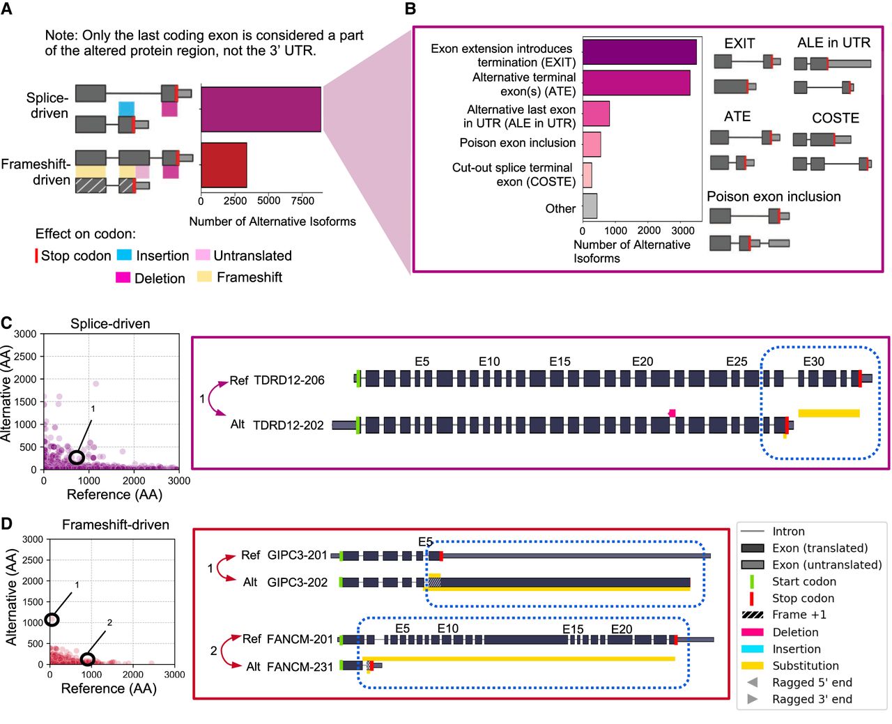 Analysis of alternative C-terminal protein sequences in GENCODE v42. (A) Frequency of alternative C-terminal categories based on splicing or frameshifts being the primary driving factor. (B) Distribution of the frequencies for various splice-driven patterns. (C) Scatterplot of the length of splice-driven C-terminal variation in the reference versus alternative. An example of this category is observed in the TDRD12 gene. TDRD12 undergoes splice-driven alteration causing an alternative terminal exon in TDRD12-202 to harbor the stop codon (D) Scatterplot of the length of frameshift-driven C-terminal variation in the reference versus alternative. Biosurfer plot examples of frameshift-driven category illustrated in GIPC43 and FANCM genes.