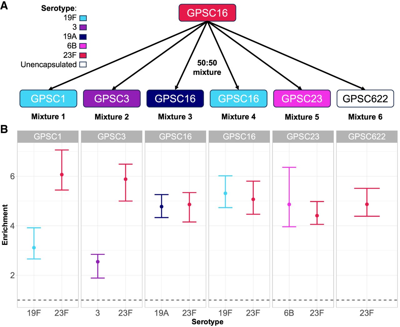 CBL enrichment in mixtures of multiple pneumococci. (A) Experimental setup. Spn23F DNA (GPSC16, serotype 23F, red) was mixed in 50:50 proportions with other S. pneumoniae isolates with different serotypes (given by color) and genotypes (given by global pneumococcal sequence cluster [GPSC]). (B) Enrichment of multiple CBL in mixtures. Bar ranges are interquartile range of enrichment from 100 bootstrap samples of reads. Data points are observed enrichment values for each CBL per library. x-axis and color describe the serotype combination of the S. pneumoniae isolate mixed with Spn23F; columns describe the GPSC. Dashed line describes enrichment = 1 (i.e., no enrichment has occurred). (GPSC) Global pneumococcal sequence cluster.