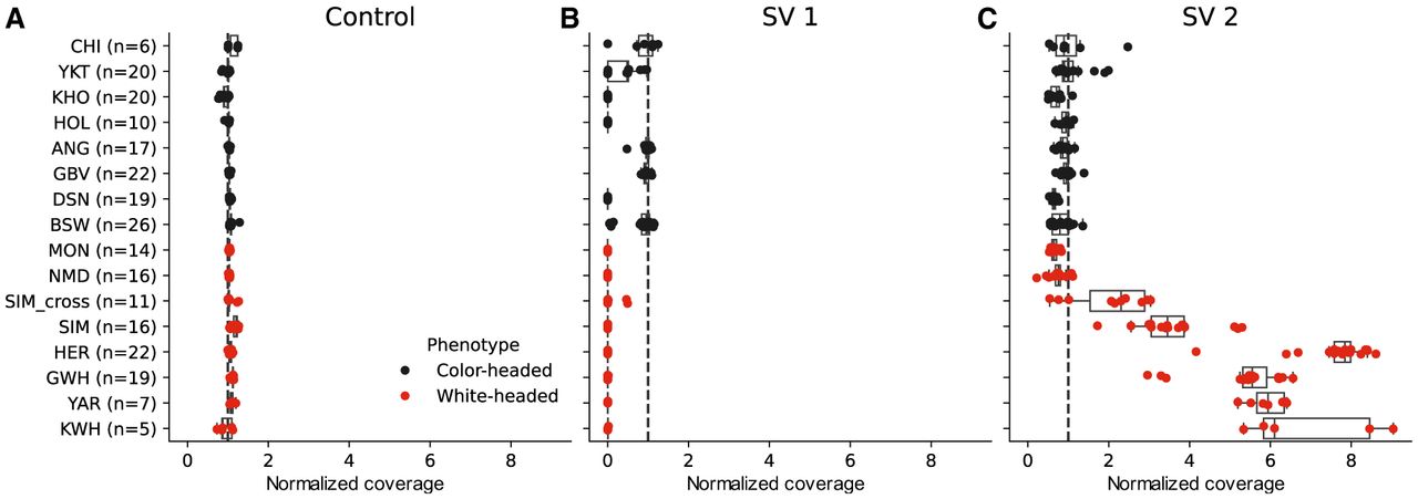Sequencing depth in short-read samples from 15 taurine breeds. (A) Normalized coverage (normalized over both sequencing depth and length of the region) per breed 1 Mb upstream of and downstream from the SV region. The dashed line indicates the expected normalized coverage of 1. (B) Similar to A, but for the smaller SV 1 region. (C) Similar to A, but for the larger SV 2 region.
