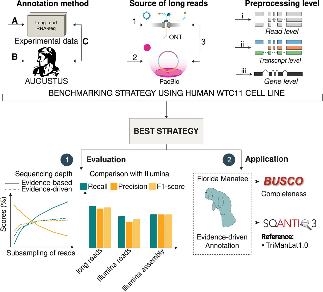 Overview of the evidence-driven, ab initio, and evidence-based annotation using long-read technologies. We compared three genome annotation strategies, evidence-based annotation using lrRNA-seq data (A), ab initio gene prediction using AUGUSTUS (B), and evidence-driven annotation combining both (C). We tested Nanopore (1) and PacBio (2) data independently and in combination (3) with processing levels ranging from raw reads (i) to transcripts (ii), and collapsing to the gene level (iii). For the best strategy defined in our benchmark, we evaluated the effect of the sequencing depth and compared to evidence-driven annotation using Illumina short-read data. Finally, we applied our strategy to a nonmodel species, the Florida manatee, applying BUSCO and SQANTI3 to evaluate the completeness of our annotation and comparing to the available Florida manatee annotation.