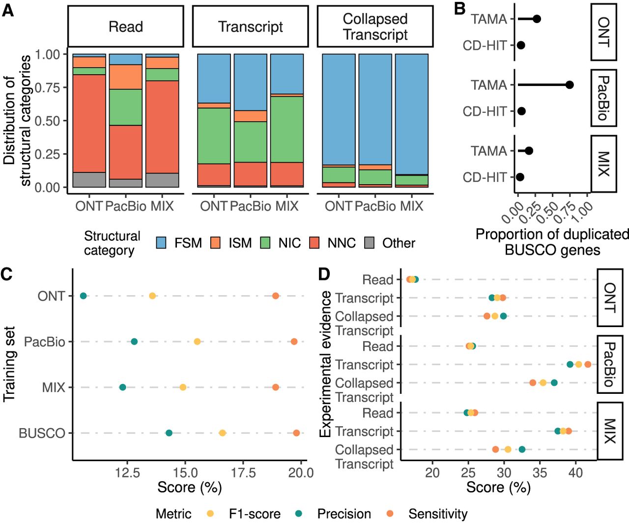 Assessment of the incorporation of long-read data to evidence-driven annotation. (A) Distribution of SQANTI3 categories at the read unique splice-junctions combination, transcript, and collapsed transcript level for PacBio data processed using Iso-Seq3 and ONT and ONT + PacBio data processed using FLAIR. (FSM) Full-Splice-Match, (ISM) Incomplete-Splice-Match, (NIC) Novel-in-Catalog, (NNC) Novel-Not-in-Catalog. (B) Redundancy of the generated transcriptome and the final collapsed transcripts set based on the proportion of duplicated BUSCO genes. (C) Evaluation of gene predictions by the three models trained with long-read data and the model trained using BUSCO genes. (D) Selection of the different long-read-based extrinsic evidence sources used for the evidence-driven gene predictions. Reads of PacBio, ONT, and a MIX of both (Read); transcript models of PacBio, ONT, and a MIX of both (Transcript) and collapsed transcripts identified in those transcriptomes (Collapsed Transcript) were used.