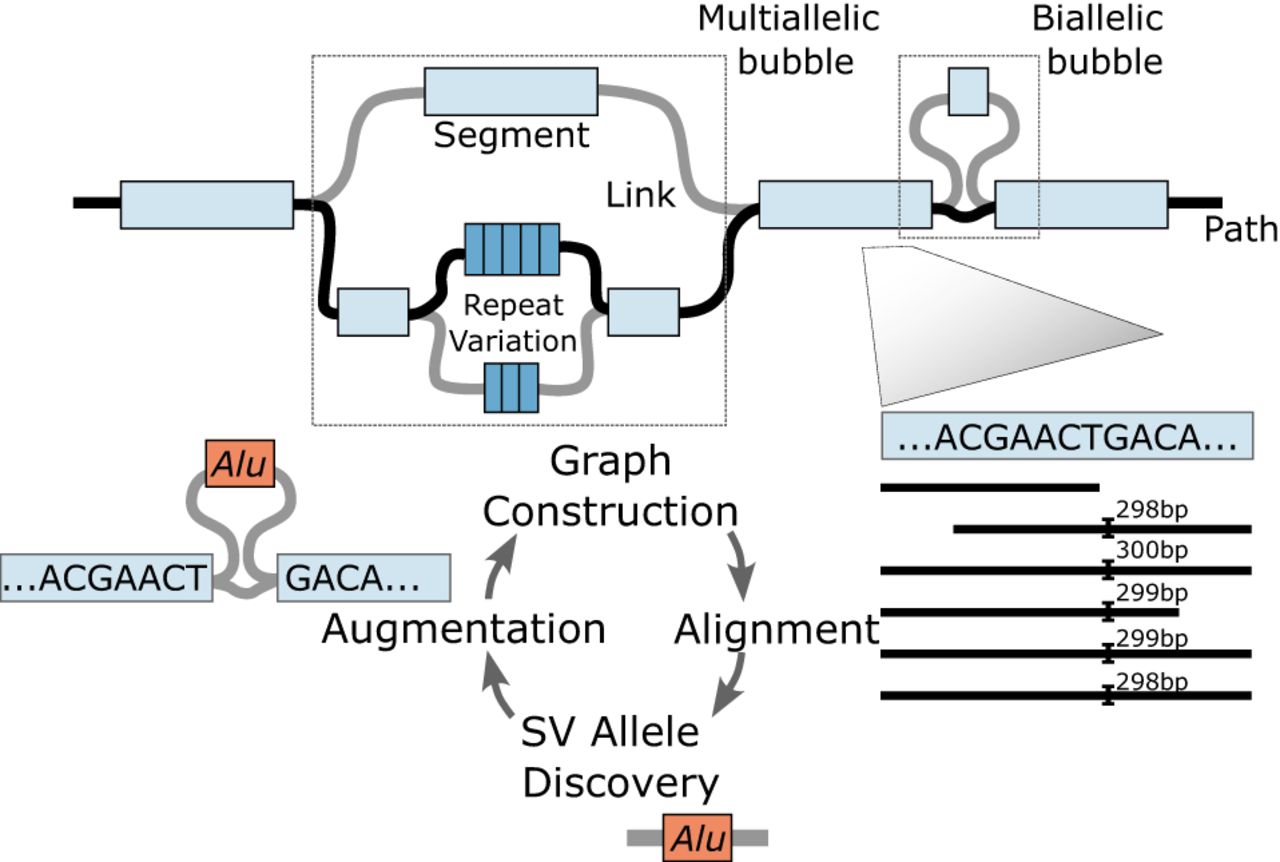 Pangenome graphs require methodological developments for scalable graph construction, accurate long-read alignments, graph-based variant discovery, and flexible graph augmentation. The upper graph shows a small portion of a pangenome graph with segments representing nucleotide sequences and links delineating possible paths through the graph (one possible haplotype path shown in black). Biallelic bubbles have two possible paths, while multiallelic bubbles with more than two paths pose significant graph construction challenges, especially for highly polymorphic and multiallelic variable number of tandem repeats (Li et al. 2020). Population-scale long-read sequencing efforts enable iterative cycles of alignments to a pangenome graph to facilitate genetic variant discovery (exemplified by a new Alu element insertion) with subsequent graph augmentation using new alleles.