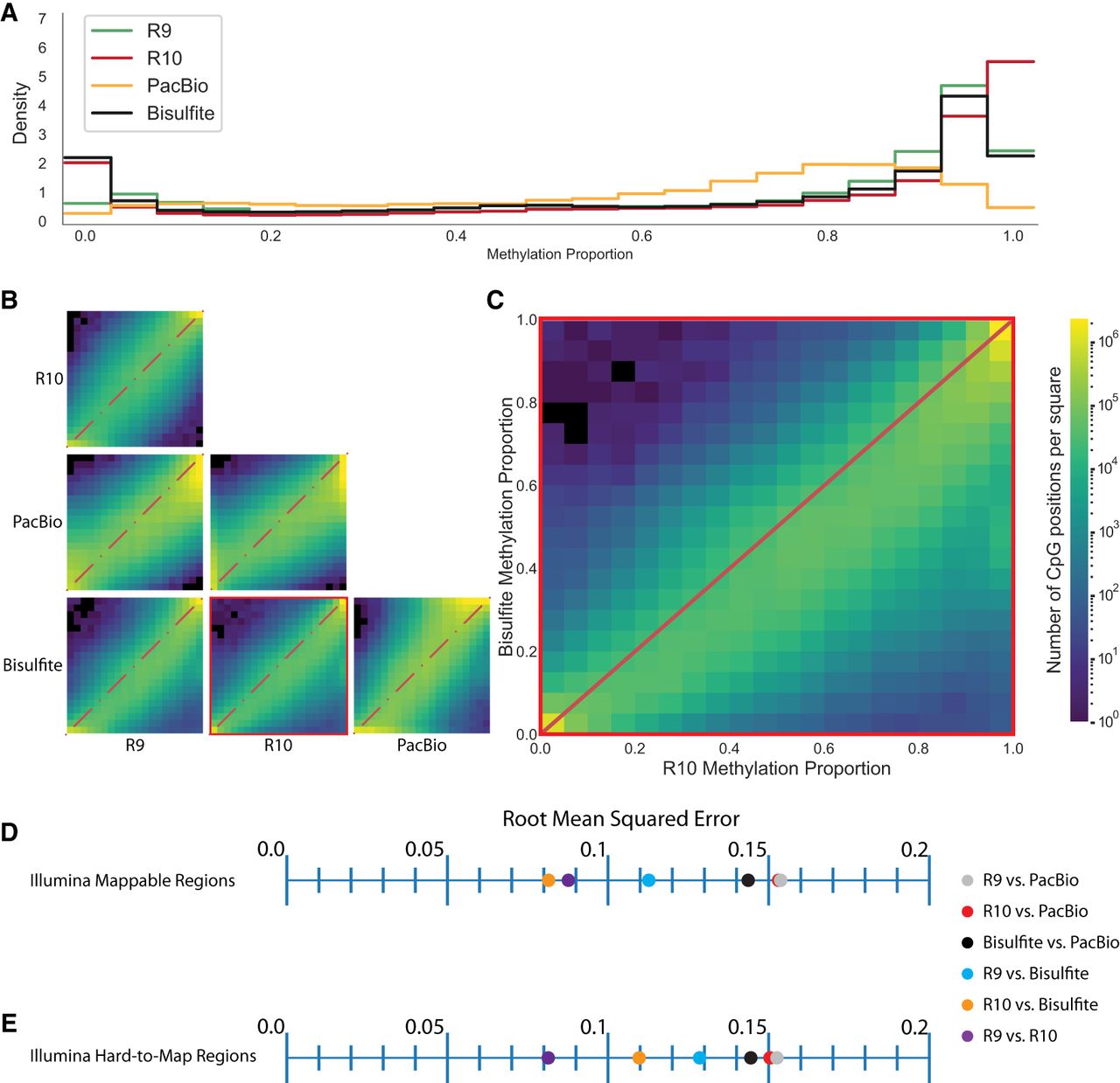 Comparison of HG002 immortalized cell line methylation calling between technologies. (A) Methylation proportion histograms for each technology. (B) Pairwise site-specific CpG methylation proportion comparison between technologies. (C) Site-specific CpG methylation proportion comparison between R10 and bisulfite sequencing. (D) RMSE values for pairwise comparisons between technology in Illumina 150 bp paired-end mappable regions as defined by BisMap. (E) RMSE for pairwise comparisons between technologies in Illumina 150 bp paired-end hard-to-map regions.