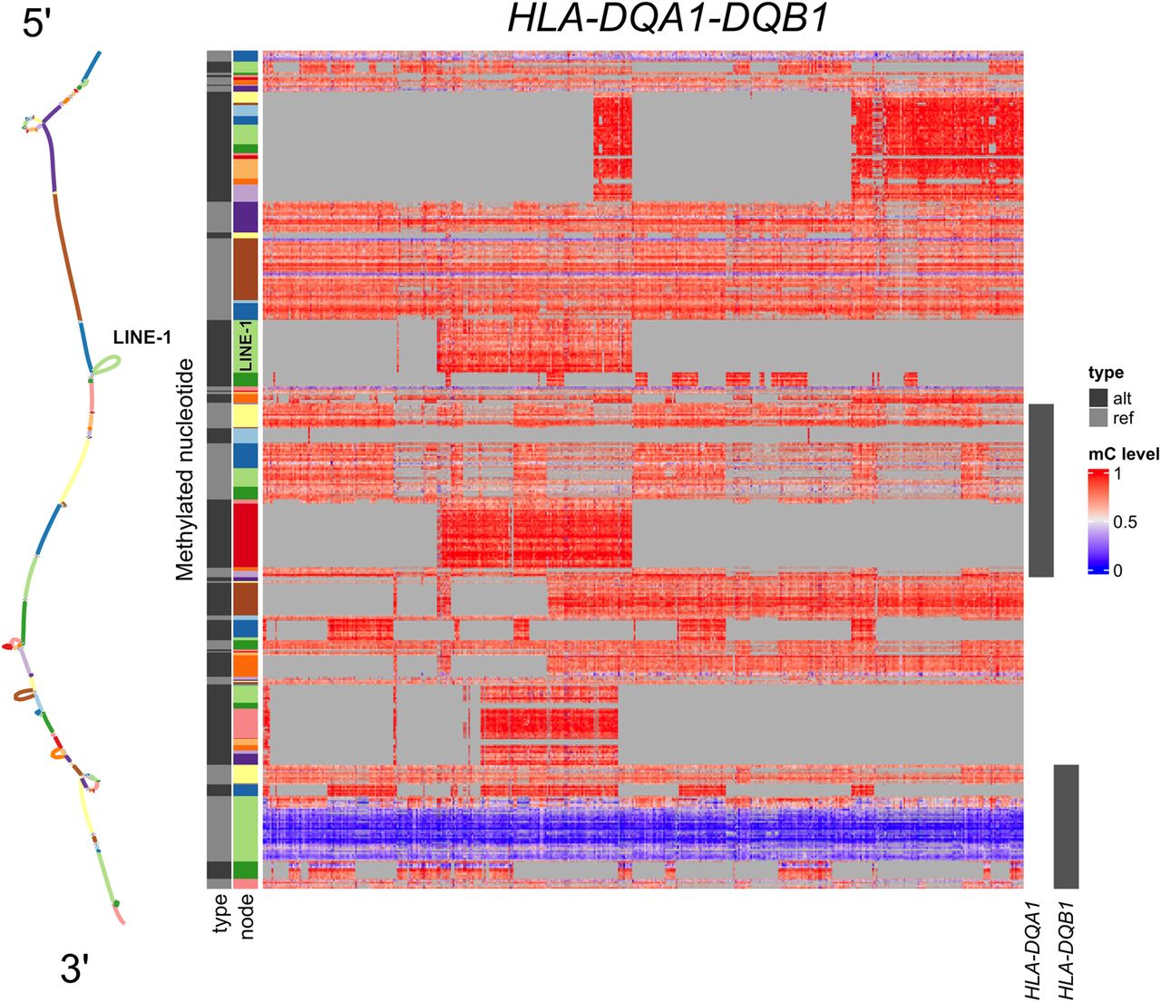Heatmap visualization of methylation patterns of CpGs (rows) in the HLA-DQA1-DQB1 locus across 435 methylomes (columns) in the GA4K pangenome. CpGs are ordered top to bottom, in the 5′ to 3′ direction as they appear in a haplotype and on the corresponding subgraph on the left. CpGs are also annotated by the node in the graph (the node row annotation) and whether it is a reference or nonreference CpG (the type row annotation, alt or ref). The right annotation shows the genes that overlap the bubbles in which the CpGs lie. Light gray cells in the heatmap are CpGs that are not genotyped in that methylome. Also indicated is the location of the full LINE-1 insertion in the graph and on the heatmap.