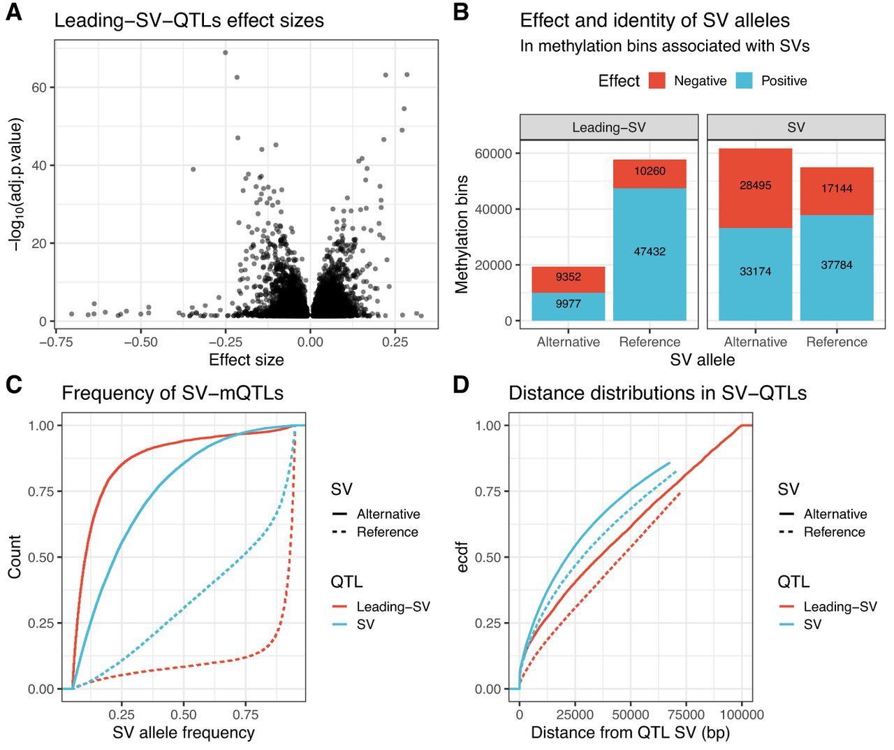 Leading mQTL variants among the pangenome SVs. (A) Volcano plots of mQTLs where the leading variant is an SV. (B) Number of methylation bins in mQTL with an SV, stratified by reference or nonreference SV allele, and positive or negative effect on methylation. (C) Allele frequency distribution of mQTL-SVs, stratified by leading versus nonleading variant, and reference and nonreference SV alleles. (D) The distribution of distances between SV-mQTLs and their methylation bins, stratified as in C.