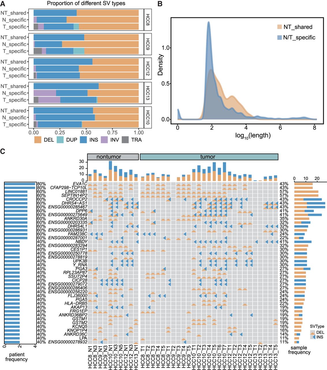 The characteristics of shared somatic SVs between adjacent nontumor and tumor tissues. (A) The frequency of each somatic SV type in different categories was shown: shared (in both adjacent nontumor and tumor tissues), T-specific (only in tumor tissues), and N-specific (only in adjacent nontumor tissues). (B) The length distribution of shared somatic SVs between adjacent nontumor and tumor tissues, as well as the SVs unique to either adjacent nontumor or tumor tissues. (C) An overview of genes overlapped by recurrently shared somatic SVs in adjacent nontumor and tumor tissues across patients. The left bar chart shows the mutation percentage across patients. The right bar chart displays the mutation percentage across samples.