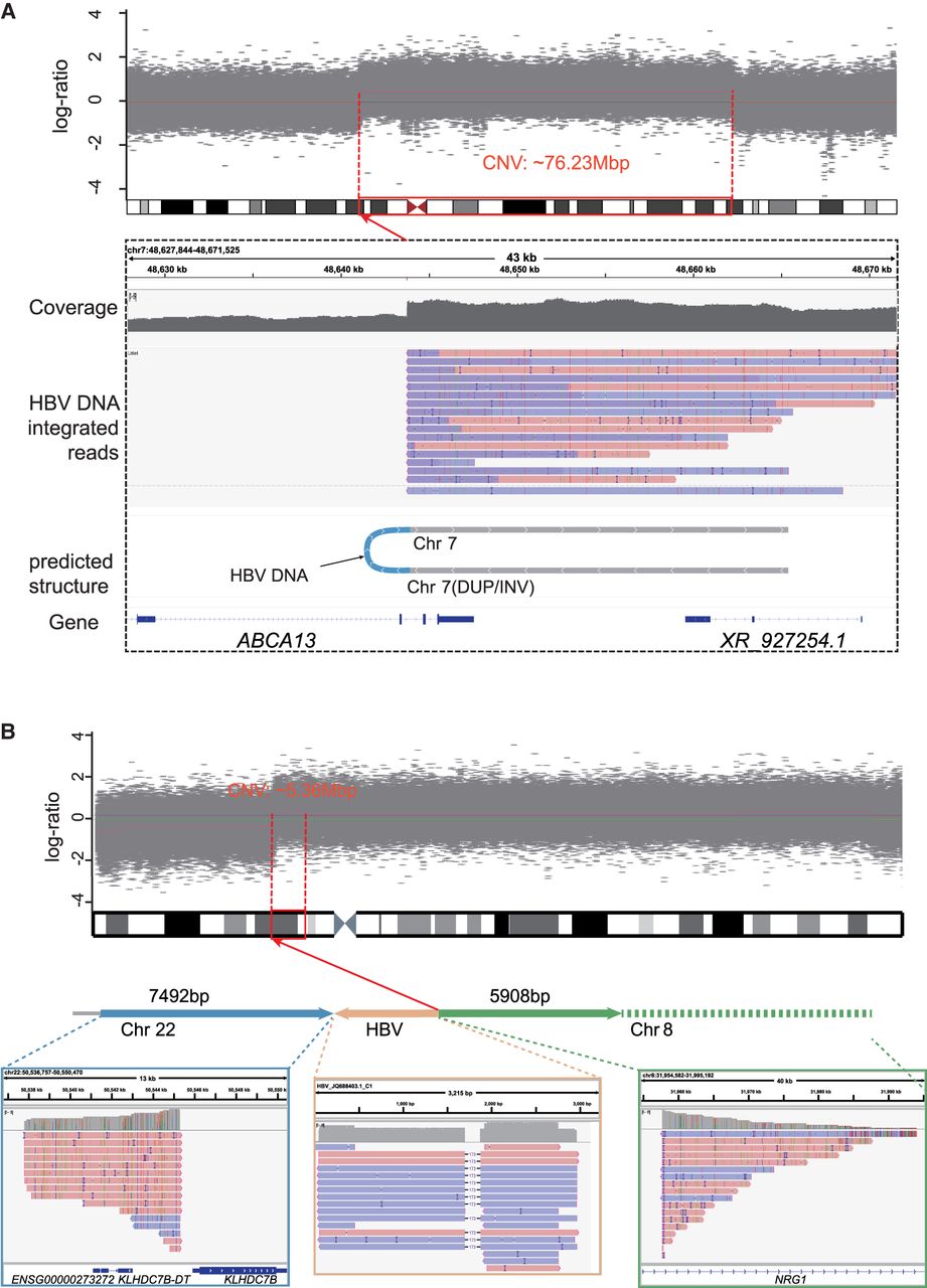 Inferring SV types based on HBV DNA integration patterns. (A) In sample HCC9_T3, an HBV DNA INS induces a fold-back INV in the host DNA. The top panel illustrates the CNV increase occurring ∼76.23 Mb downstream from the integration site. Sequencing data demonstrate that long reads encompass the sequences flanking the HBV integration, revealing identical breakpoints and reverse DUP of the adjacent sequences. (B) An example of HBV DNA integration resulting in a TRA (HCC13_T2). The Integrative Genomics Viewer (IGV; Robinson et al. 2011) plot below illustrates the alignment of long reads to Chr 22, HBV, and Chr 8. The plot above depicts the concordance of its breakpoint on Chr 8 (red dashed line) with a breakpoint of ∼5.36 Mbp CNV (gray shade).