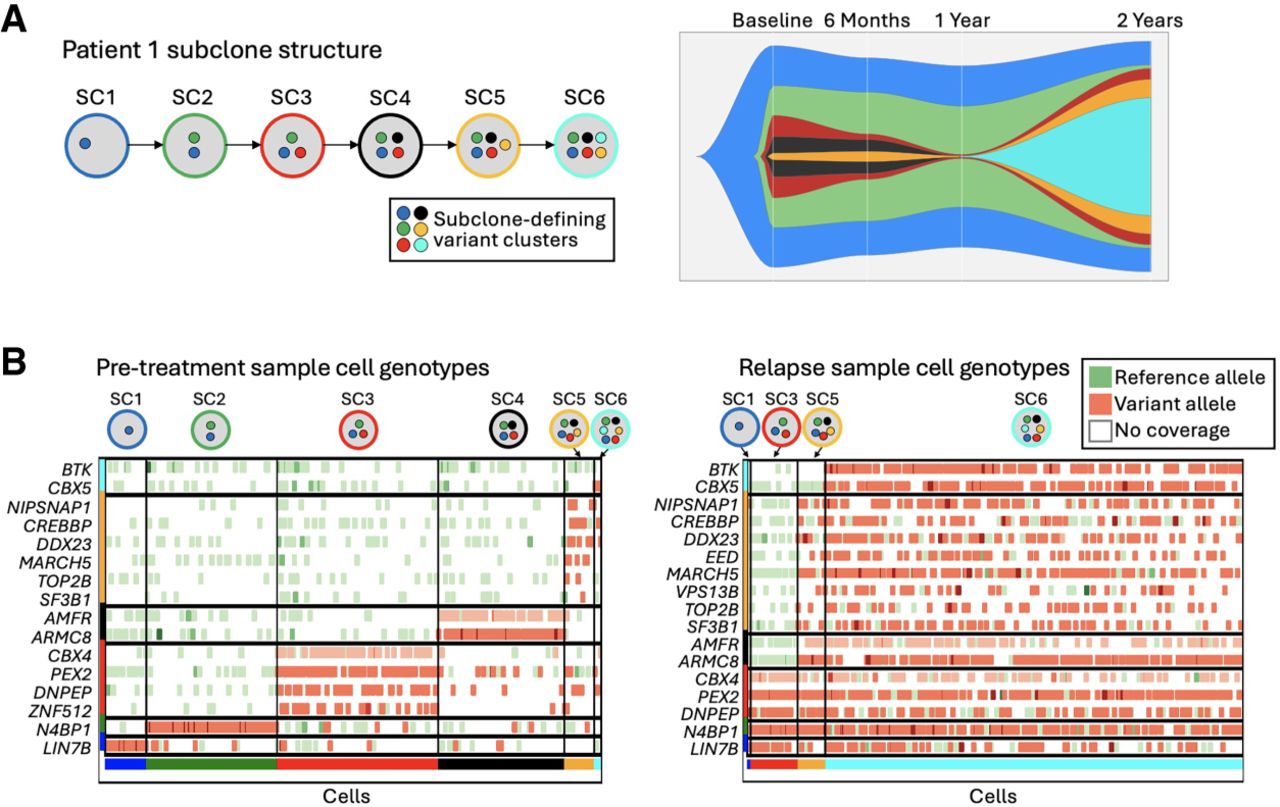 Visualization of single-cell genotypes to identify subclone structures. (A) The subclone structure of patient 1 was identified in the bulk DNA sequencing data. Subclones are depicted by the colored circles, with representative variant clusters inside each circle. The fishplot shows the prevalence of each subclone throughout treatment. (B) The cell genotypes at subclone-defining variants in patient 1. Each cell that was successfully assigned to a subclone is shown (x-axis), along with every somatic variant that was present in the WES data, labeled with the gene that the variant belongs to (y-axis). Green markers represent only reference alleles present in the scRNA-seq reads at the given variant location within the cell, and red markers indicate at least one scRNA-seq read in the cell contains the somatic variant allele. Darker marker coloring indicates an increased number of reads supporting that genotype. Variants and cells are grouped by their subclone assignment.
