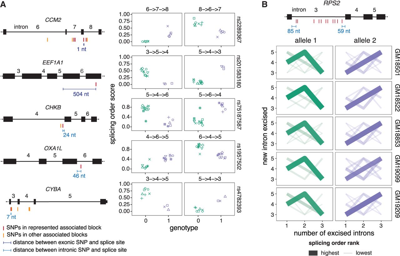 Splicing order changes are associated with specific genetic variants. (A, Left) Schematic representation of each gene, with exons as rectangles and introns as horizontal lines. SNPs represented in the right plots and other SNPs in the same haplotype blocks are depicted in red, while SNPs that are significantly associated with splicing order of the same intron group but in a different haplotype block are shown in light orange. The distance between the SNPs represented in the right plots and the closest splice site are depicted in blue. (Right) Examples of splicing orders in five genes that are significantly associated with the genotypes of the indicated SNPs. Each point represents one allele and the identity of the splicing order is shown at the top of each plot, with intron numbers separated by arrows. Each LCL is displayed in a different shape. (B) Splicing order plot showing allele-specific splicing orders for introns 3–5 of RPS2 in five LCLs. The thickness and opacity of the lines are proportional to the frequency at which each splicing order is used, with the top-ranked order per intron group set to the maximum thickness and opacity. The gene structure is shown at the top, with exons as rectangles, introns as lines, and associated SNPs as in (A).