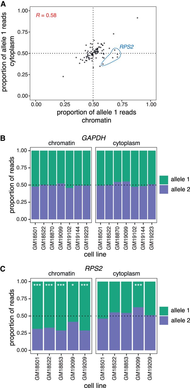 Splicing order changes do not alter cytoplasmic mRNA abundance. (A) Correlation in allele-specific mRNA abundance between chromatin and cytoplasm for intron groups that showed significant allele-specific splicing orders. The proportion of allele 1 reads divided by the total number of reads for alleles 1 and 2 is shown for each subcellular compartment. Each dot represents one gene in one LCL. RPS2 is highlighted in blue dotted circles for the five LCLs that showed splicing order changes in this gene and that are displayed in Figure 2B. (B) and (C) Proportion of (B) GAPDH (B) or (C) RPS2 reads mapping to each allele in chromatin and cytoplasm. The number of reads mapping to each allele on chromatin-associated or cytoplasmic RNA was compared using Qllelic (Mendelevich et al. 2021) or a two-sided binomial test, respectively. (***) P-value < 0.001 and proportion of allele 1 reads <0.4 or >0.6; (*) P-value < 0.01 and proportion of allele 1 reads <0.45 or >0.55.