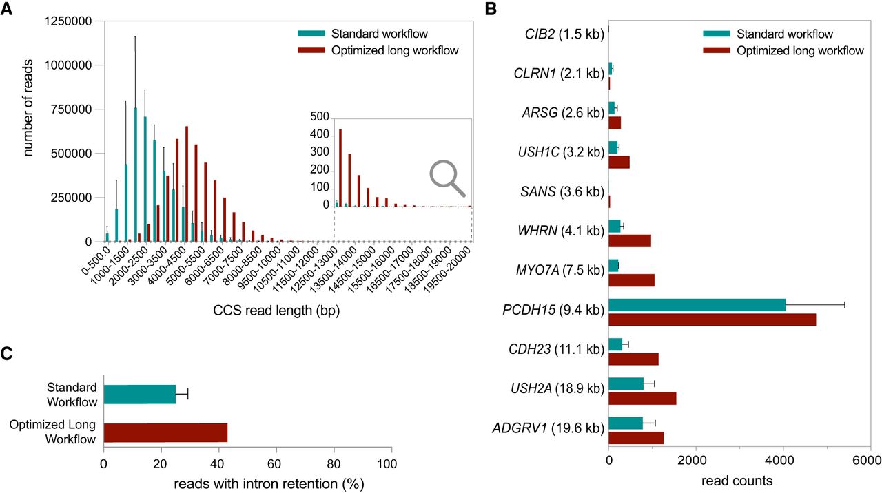 Exploring the Usher syndrome–associated transcript isoform landscape in the human neural retina using PacBio long-read mRNA Iso-Seq. (A) The size distribution of sequenced transcripts derived from the standard workflow (blue) and optimized long workflow (red) data sets. For the standard workflow data set, the mean size distribution across the three sequenced samples is depicted ± standard deviation (SD). (B) Comparison of Usher syndrome–associated transcript coverage between the standard workflow and optimized long workflow data set. The Usher genes are arranged in order from smallest to largest coding sequence, with the coding sequence length of the largest known transcript for each gene provided in brackets. For the standard workflow data set, the mean ± SD transcript length across the three sequenced samples is presented. (C) Quantification of the percentage of reads displaying intron retention in standard workflow samples 1–3 (mean of 3 samples ± SD) versus long workflow sample 4.