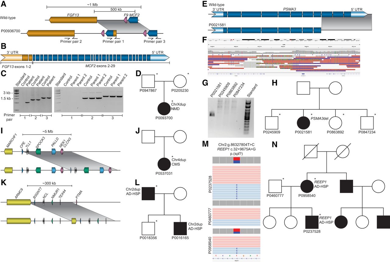 Visualization of candidate disease-causing SVs in the “unsolved” cohort. In a sporadic patient (P0093700) with arthrogryposis multiplex congenita, we detected an X-Chromosomal tandem duplication (A–D). The duplication spans from intron 1 of MCF2 to intron 2 of FGF13 and also includes F9 (A). The result of the duplication is a hypothetical fusion gene, including FGF13 exons 1–2 and MCF2 exons 2–29 (B). The duplication was validated by PCR and agarose gel electrophoresis (C) using primers targeting the breakpoints of the duplication, and a combination of the MCF2 forward and FGF13 reverse primers (primer pair 1, A,C). In a sporadic patient with psychomotor development delay (P0021581), we detected a deletion of PSMA3 exons 9–11, here shown as a cartoon (E) and as a screenshot using IGV (F). The deletion was validated by agarose gel electrophoresis (G) and Sanger sequencing. The index P0021581 has three healthy siblings who do not carry the deletion (H). In a sporadic female patient (P0537031) with congenital malformation syndrome, we detected a 5 Mb tandem duplication on Chromosome 4, visualized here as a cartoon (I). The pedigree is shown in J. In a sporadic male patient (P0016165) with autosomal dominant spastic paraplegia, with a similarly affected father, we detected a 300 kb tandem duplication on Chromosome 2, visualized here as a cartoon (K). The pedigree is shown in L. In a family with an affected mother and son (P0847234 and P0958540), we detected an intronic variant in REEP1 (M). The reads are colored by haplotag; pink and light blue represent different alleles in M. The index patient also has an affected uncle, whose sample was not sequenced (N). Sequenced individuals are marked with an asterisk (*) in the pedigrees (D,H,J,L,N). (NMD) Neuromuscular disorder, (CMS) congenital malformation syndrome, (AD-HSP) autosomal dominant hereditary spastic paraplegia.