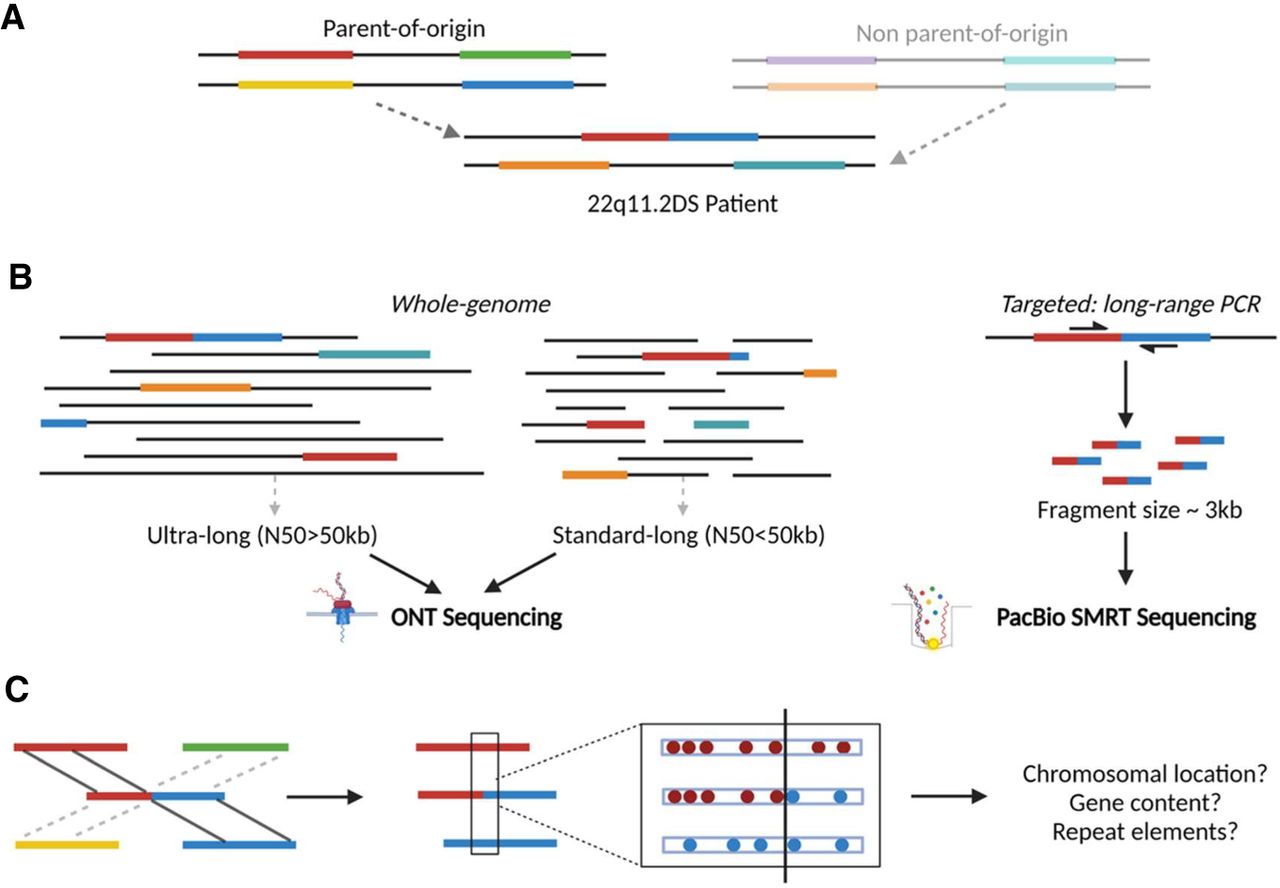Study design and data analysis of 22q11.2DS recombination loci. (A) LCR22 composition of a family trio. The parent-of-origin is the parent in whom the recombination occurred. The red-blue composition in the patient represents the recombined LCR22 structure. In this example, an interchromosomal recombination is presented, although intrachromosomal recombinations are possible as well. (B) The patient and the parent-of-origin were sequenced using one or a combination of whole-genome ultra-long and/or standard long ONT sequencing. In one patient (AB004), a targeted breakpoint-specific long-range PCR was designed in combination with PacBio single-molecule real-time (SMRT) sequencing of the fragment. (C) Following de novo assembly of the different proximal and distal LCR22 alleles in the patient and parent-of-origin, the recombination-involved parental haplotypes (proximal and distal) were identified via SNP comparison, followed by a delineation of the breakpoint locus by LCR22 proximal-specific (red) and distal-specific (blue) SNPs. These SNPs are shared between the patient and the parental proximal or distal LCR22, respectively, but not with the other (proximal or distal) LCR22 involved in the CNV. The recombination locus was scrutinized for its precise coordinates, elucidating the genes and repetitive elements involved.