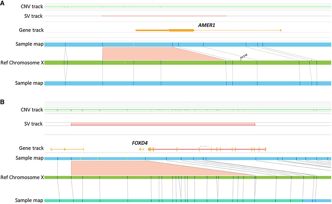 Optical genome maps show deletions in two cases. (A) Partial heterozygous deletion of the AMER1 gene in a female fetus with osteopathia striata with cranial sclerosis (OS-CS) including anencephaly and cervical rachischisis (case 8). (B) Heterozygous deletion of the FOXD4 gene in a fetus with spina bifida (case 9).