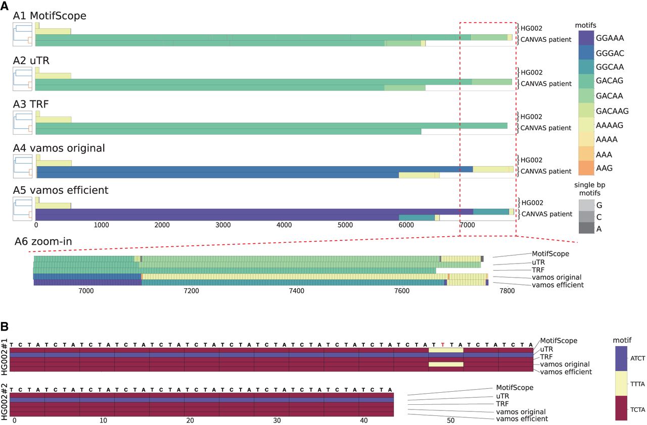 Motif characterization with different methods. (A) The motif characterization of the RFC1 repeats in HG002 and a CANVAS patient. The results from (A1) MotifScope, (A2) uTR, (A3) TRF, (A4) vamos original, (A5) vamos efficient of the RFC1 repeat in the HG002 assembly and the assembly of a Dutch CANVAS patient, and (A6) zoomed-in view of the circled region of one patient allele are visualized. In each subfigure, the left panel shows the clustering of the sequences, the right panel shows the composition of the repeat, with distinct motifs represented in different colors, as indicated by the color bar on the right side of the figure. (B) The motif characterization of forensic loci D2S441 in HG002. This shows the visualization of the decomposing result from MotifScope, TRF, uTR, vamos efficient, and vamos original of the assembly of the forensic D2S441 locus in HG002 genome assembly, with distinct motifs represented in different colors, as indicated by the color bar on the right side of the figure.