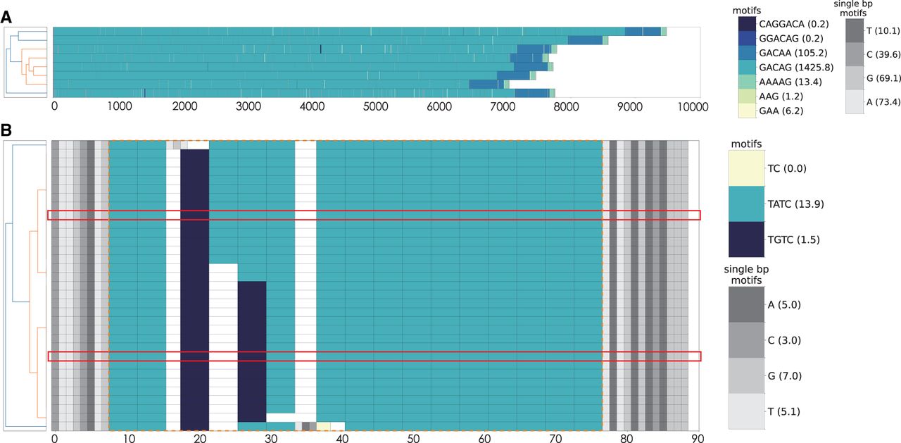 Motif characterization with MotifScope on long reads. (A) Motif characterization of the spanning reads of the RFC1 repeat in the blood of a CANVAS patient. The sequences contain the RFC1 repeat and 10 bp sequences flanking both sides of this region. (B) Motif characterization of the spanning reads of forensic loci D3S135. The two assembly alleles of the HG002 genome are highlighted in red boxes and the repeat is highlighted in the orange box with 10 bp flanking this region. In each figure, the clustering of the sequences is shown in the left panel, the right panel shows the motif composition of the repeat, with distinct motifs represented in different colors, as indicated by the color bar on the right side of the figure. The number following the motif on the color bar indicates the average number of occurrences of the motif per read.