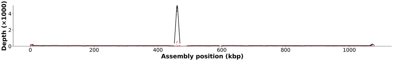 PacBio HiFi mapping coverage for Chromosome XII in S. cerevisiae illustrated using NucFreq; the coverage spike indicates the presence of a repetitive region which is known to contain ∼150 tandemly repeated copies of a 9.1 kb rDNA unit.