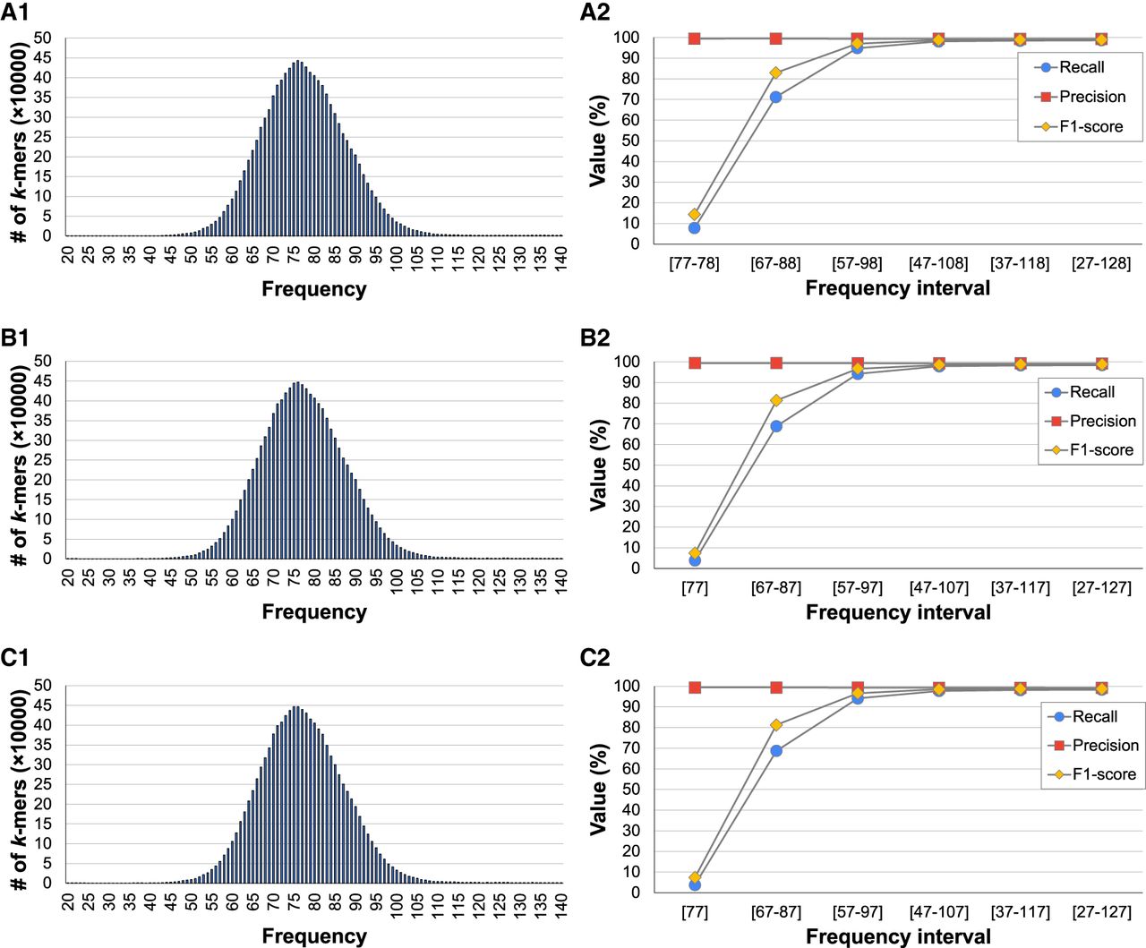 PacBio HiFi k-mer distribution for k = 17 (A1), k = 21 (B1), and k = 25 (C1) for S. cerevisiae; precision, recall, and F1-score for unikmers when k = 17 (A2), k = 21 (B2), and k = 25 (C2) for longer and longer intervals centered at the average sequencing coverage.