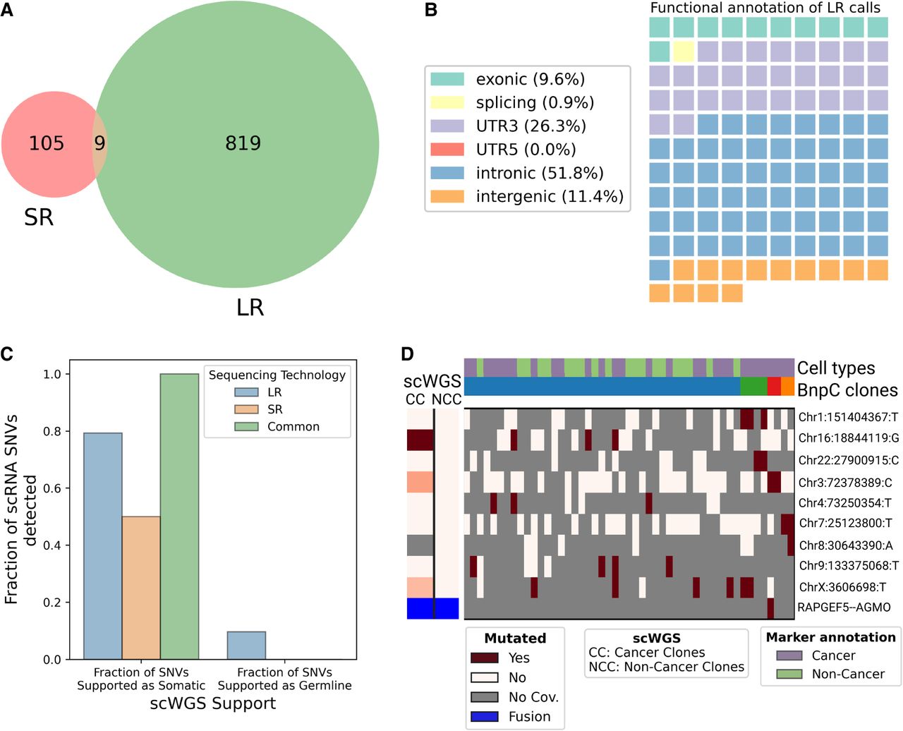 Analysis of SR scRNA-seq data and comparison with LR data. (A) Venn diagram of the intersection between SR (SComatic) and LR (LongSom) somatic calls in LR scRNA-seq data from all patients aggregated. (B) Waffle plot representing each of the 114 somatic SNVs detected by SComatic in SR scRNA-seq data, colored by their RefSeq functional annotation. (C) Barplot of the fraction of all loci that is supported by scWGS data as either somatic or germline, colored by whether they were called in LR data, SR data, or both. (D) BnpC clustering of single cells from the tumor biopsy of patient P1 (columns) by somatic SNVs and fusions (rows) called in SR scRNA-seq data. Red indicates that a loci is mutated in a cell (bet-binomial P-value < 0.05), white that it is not, and gray indicates no coverage in the cell at a given locus. Rows are colored according to the mutation status of aggregated scWGS diploid (Noncancer Clones) or aneuploid (Cancer Clones) cells. Fusions appear in blue. Columns are colored from top to bottom by marker-based annotation and BnpC subclones inferred from somatic SNVs and fusions.