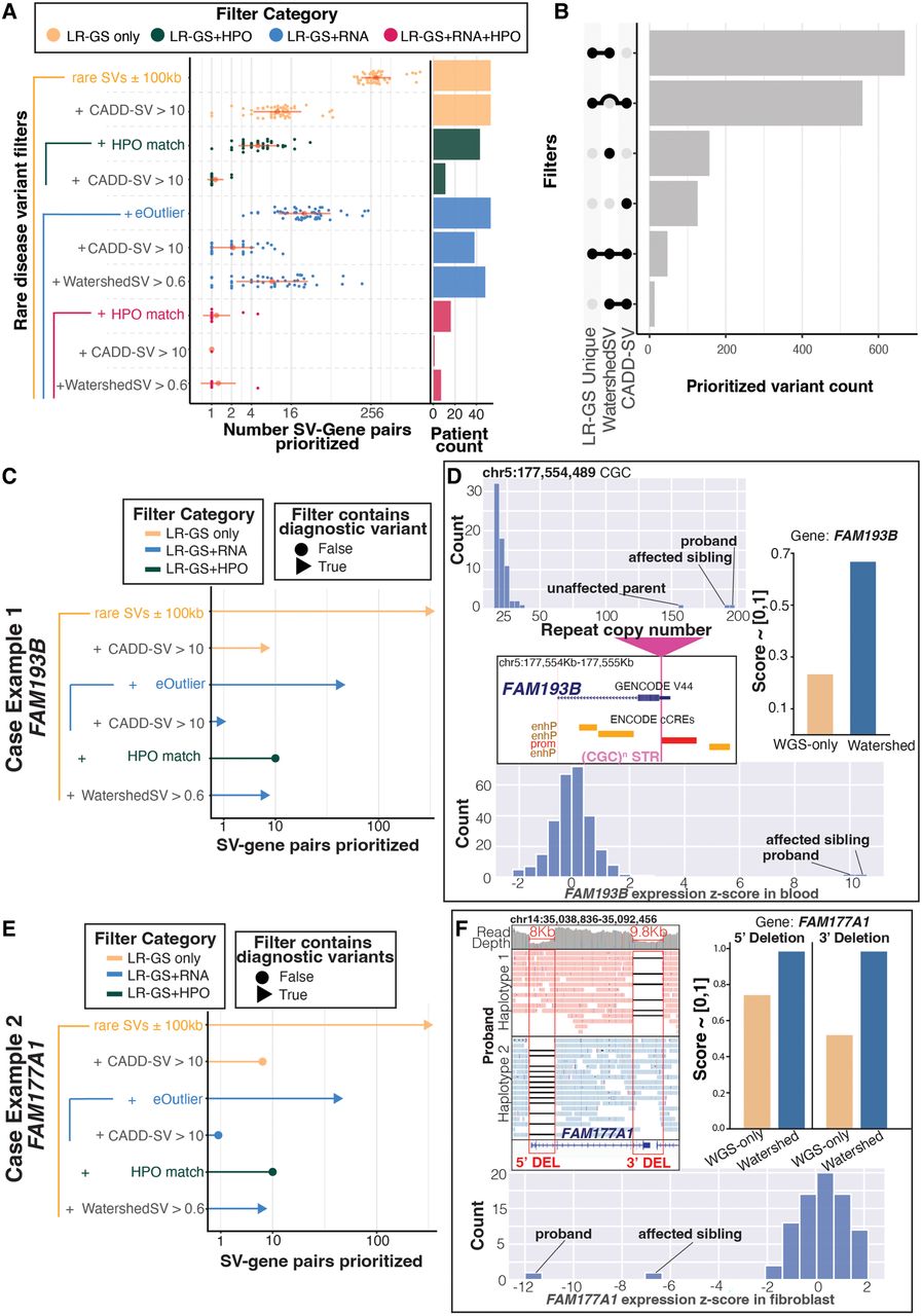 Watershed-SV prioritizes symptom-relevant functional rare SVs from UDN LR-GS data set. (A) Swarmplot for number of gene-SV pairs prioritized per individuals in the UDN LR-GS data set under different set of combined filters. There are four filter categories: LR-GS-only filters, LR-GS + HPO filters, LR-GS + RNA filters, and LR-GS + RNA + HPO filters, in increasing level of stringency due to increasing types of filters jointly applied; red dot represents the mean number of gene-SV pairs across individuals, red horizontal line represents standard deviation; x-axis is in log2 scale; the bar plot on the right shows number of samples with significant prioritizations. (B) UpSet plot depicting number of gene-SV pairs prioritized by Watershed-SV (posterior > 0.6), CADD-SV (score > 10), and whether the SV is uniquely identified using LR-GS. (C,E) Case example 1, rare TREs shared by both siblings, and case example 2, rare compound heterozygous deletions in siblings. Lollipop plot shows which set of filter includes the candidate diagnostic gene-SV pair (triangle) and which does not (circle), height of the lollipop represents number of gene-SV pairs prioritized in log2 scale. (D) Panels depict the TR copy numbers of the siblings and unaffected parent with less-expanded allele. The TRE loci is in 5′ UTR of FAM193B. Both Watershed-SV and CADD-SV can prioritize this but not WGS-only baseline model. Both siblings have extremely high overexpression Z-scores. (F) Panels depict the compound heterozygous deletions phased onto both alleles for FAM177A1, causing LOF of gene and thereby underexpression outliers. Only Watershed-SV succeeded at prioritizing both variants.