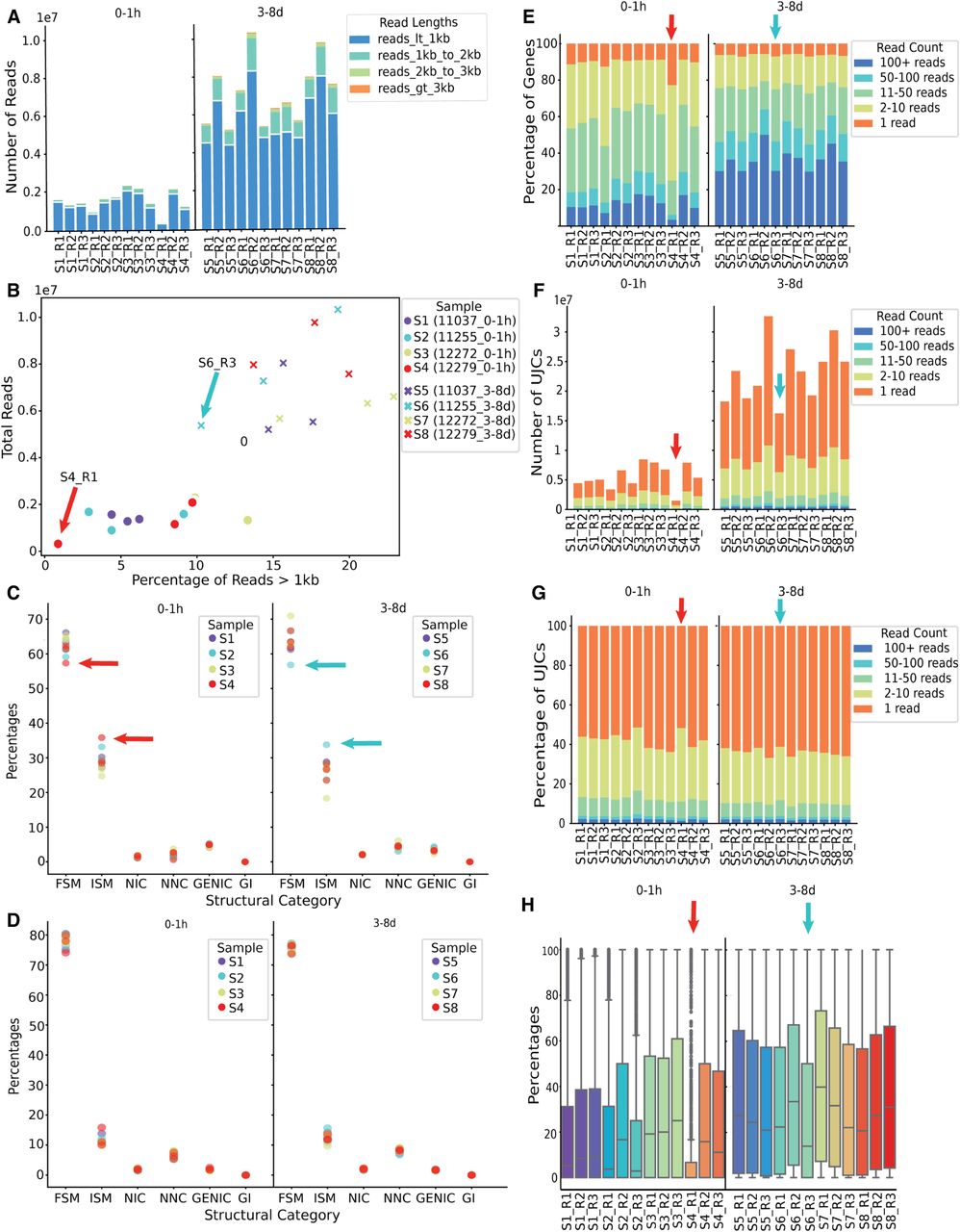 SQANTI-reads analysis of Drosophila samples. (A) Number of mapped reads by experimental group labeled with read length. (B) Percentage of mapped reads >1 kb versus percentage of reads that are FSM. Dots represent the early stage (0–1 h after eclosion) and crosses indicate the adult stage (3–8 days old). The four genotypes are indicated with four different colors. (C) Percentage of reads mapping to genes in each SQANTI3 structural category (D) Percentage of reads mapping to genes in each SQANTI3-QC structural category for reads >1 kb (E) Number of genes detected with breakdown by the number of reads mapped to each gene. (F) Number of UJCs detected with breakdown by the number of reads associated with each UJC. (G) Percentage of UJCs detected with breakdown by the number of reads associated with each UJC. (H) Distribution of the percentage of FSM reads by gene across samples.