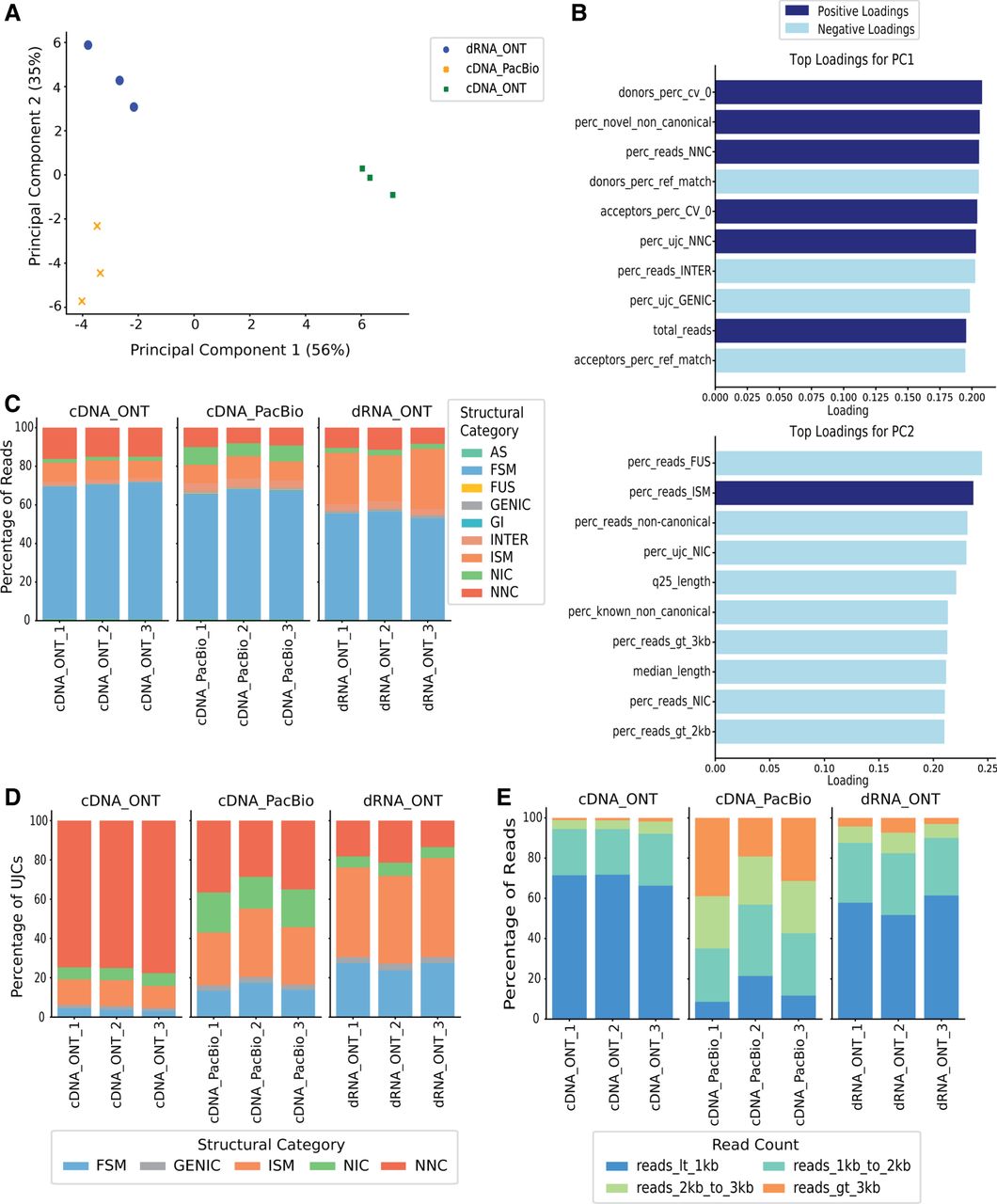 SQANTI-reads PCA analysis of LRGASP WTC11 samples. (A) PCA using SQANTI-reads quality features. The percentage of variance explained by each principal component (PC) is labeled on each axis in brackets. (B) Top 10 Loadings for PC1 and PC2. (C) Distribution of reads in SQANTI3 structural categories. (D) Distribution of UJCs in structural categories. (E) Distribution of read lengths for all mapped reads.