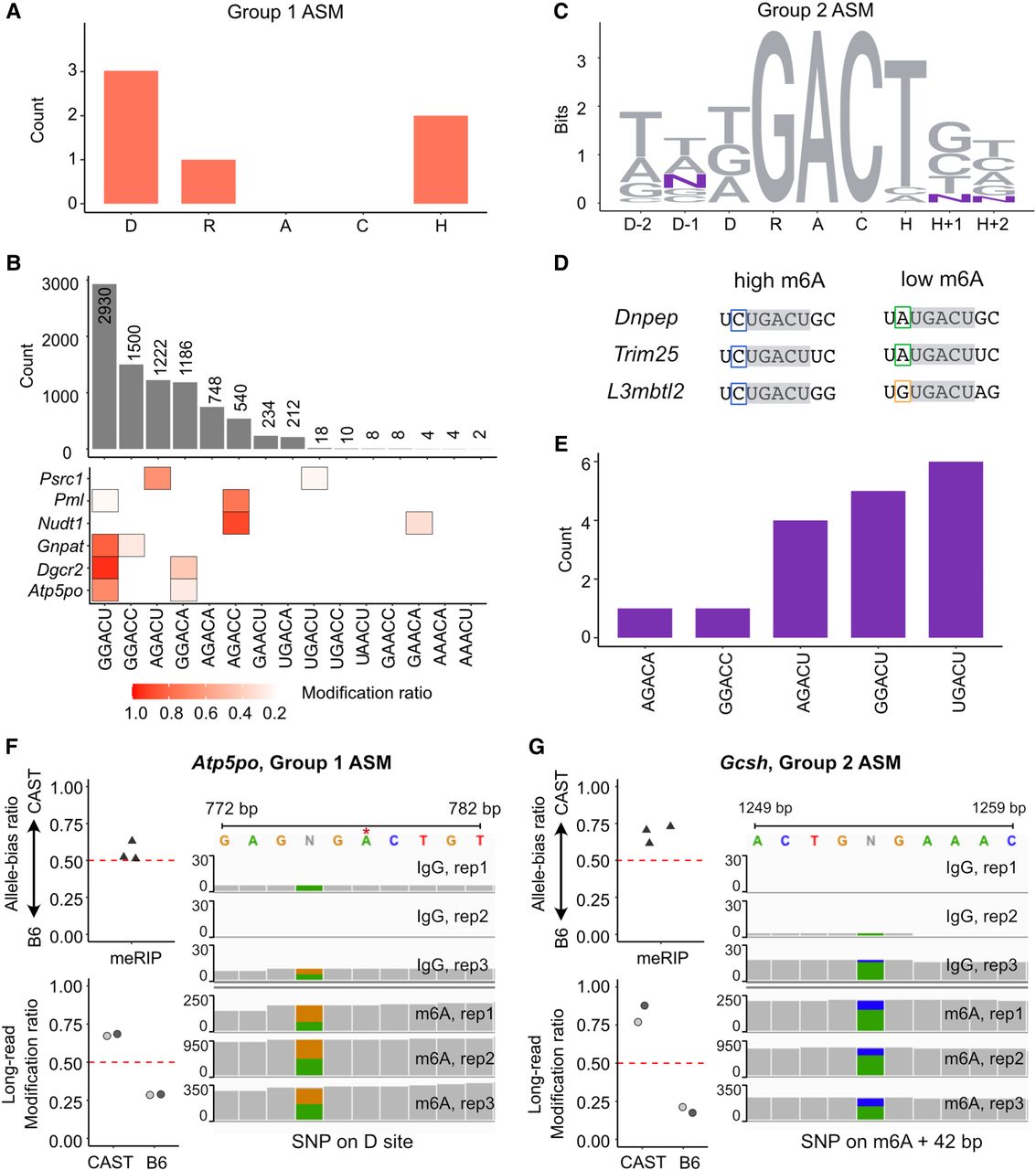 Characterization of ASM sites and orthogonal detection with MeRIP-seq. (A) SNP distribution in Group 1 ASM. (B) Motif frequencies and modification ratios of motif sequences. The top bar plot illustrates motif sequence frequencies in all m6A instances, while the bottom heatmap indicates modification ratios. The first row presents the modification ratio of all instances and the following six rows represent the modification ratio on each motif sequence differentiated by SNPs from two alleles of Group 1 ASM sites. (C) Information content of the extended DRACH motif in 17 Group 2 ASM sites shown in DNA sequence. The D − 1 site has three SNPs, while the H + 1 and H − 2 sites each have one SNP. (D) Extended motif sequences where the D − 1 site possesses SNPs. The gray box represents the DRACH motif, in which all three genes share the same sequence (UGACU) followed by U on the D − 2 site. (E) Motif prevalence in Group 2 ASM. The UGACU motifs are predominantly observed, contrasting with the common m6A motifs, which are typically represented by GGACU. (F,G) Orthogonal detection of ASM through MeRIP-seq and long-read sequencing. On the top panel, points illustrate the allele-bias m6A ratio (proportion of reads from CAST allele) derived from three replicates of MeRIP-seq analysis. The Integrative Genomics Viewer browser displays MeRIP-seq reads on SNPs adjacent to m6A sites, which correspond to the MeRIP-seq allele-bias ratio. The points in the bottom panel indicate the modification ratio of each allele from long-read sequencing, with gray color pairs representing data from two replicates. Two examples from Atp5po, Group 1 ASM (F), and Gcsh, Group 2 ASM (G) are shown.