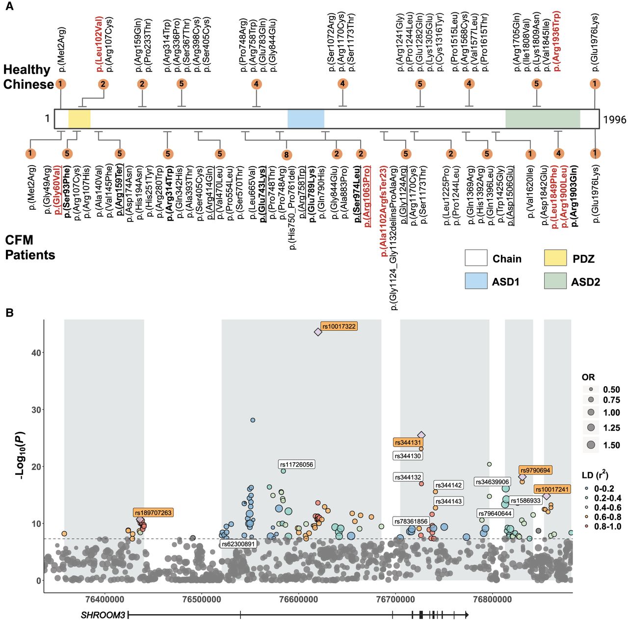 Distribution of putative deleterious variants and common SNP associations in SHROOM3 among CFM patients and healthy Chinese. (A) The schematic delineates the PDZ, ASD1, and ASD2 domains of the SHROOM3 protein, color-coded in yellow, blue, and green, respectively. The upper panel enumerates the deleterious variants identified in healthy Chinese individuals, and the lower panel details those found in CFM patients, with variants from European/Hispanic/Australasian ancestry underlined. The count of deleterious variants within specific regions is indicated by numbered brown circles. Variants emphasized in red denote those predicted as pathogenic by the ESM1b and AlphaMissense algorithm. Likely pathogenic variants determined using combination patterns are marked by bold in CFM patients. (B) Manhattan plot of CFM-associated variants in SHROOM3. This plot showcases variants with a minor allele frequency above 0.05. The size of each dot indicates the odds ratio of the corresponding variant. The plot demarcates five linkage disequilibrium (LD) blocks within SHROOM3 in gray, with the color-coding reflecting r² values, signifying the correlation between the lead SNP and other variants within each LD block. Lead SNPs are marked with purple rhombus, and their rsID is shown with an orange background. eQTL sites are identified with rsIDs with a white background. (OR) Odds ratio.