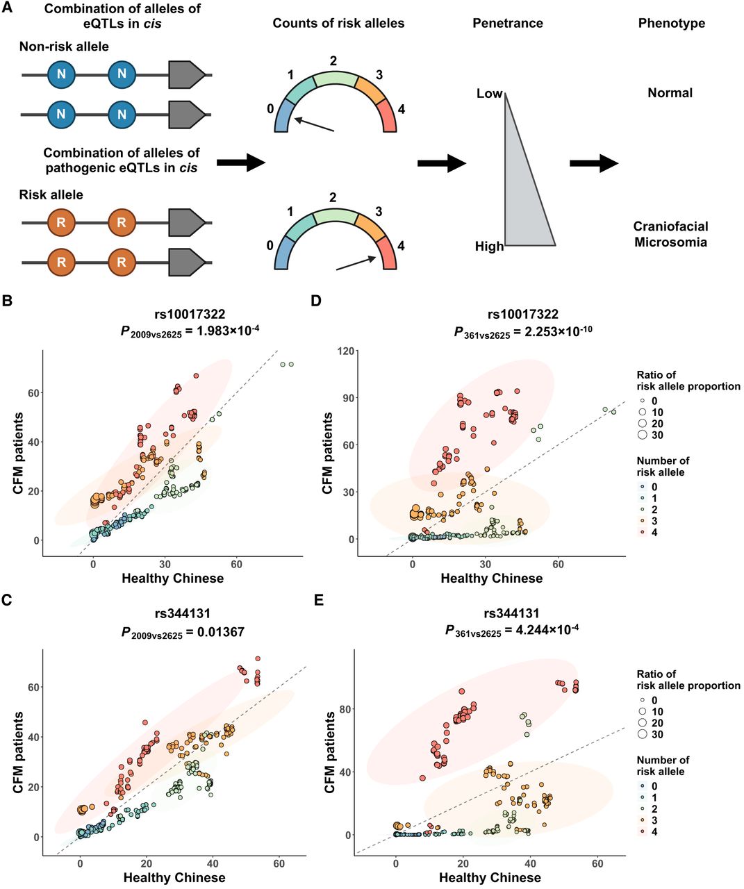 Patterns of haplotype combinations involving putatively pathogenic eQTLs. (A) Conceptual diagram hypothesizing that the combination of risk alleles from SHROOM3 eQTLs correlates with the CFM phenotype. The greater the number of risk alleles carried, the higher the likelihood of being a CFM patient. (B,C) Risk allele combinations involving the putatively pathogenic eQTL rs10017322/rs344131 and other SHROOM3 eQTLs in 2009 Chinese CFM patients and 2625 healthy Chinese individuals. Carriers of four risk alleles show a significant enrichment (P = 0.0001983) in CFM patients. (D,E) Risk allele combinations as in B,C but analyzed in 361 CFM patients who strongly contribute to the SHROOM3 signal compared with 2625 healthy Chinese. Individuals carrying four risk alleles demonstrate a more significant enrichment (P = 2.253 × 10−10) in CFM patients. Ratio of risk allele proportion indicates the proportion of the risk allele compared with CFM patients and healthy Chinese.