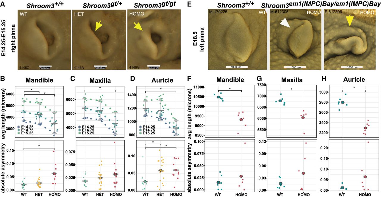 In vivo analysis of Shroom3 zygosity in mice is associated with microtia and facial asymmetry. (A) Lateral view of 3D rendered developing auricles (right side) from E14.25 wild-type (Shroom3+/+), heterozygote (Shroom3gt/+), and homozygote (Shroom3gt/gt) littermates following optical projection tomography. Note the marked microtia in the homozygote and the subtle dorsal auricular deficiency in the heterozygote (both marked by yellow arrows in the respective images) compared with the wild-type littermate. (B–D) Landmark-based quantitative assessment of auricular, mandibular and maxillary length (top) and absolute asymmetry (bottom) in wild-type, Shroom3gt/+, and Shroom3gt/gt embryos between E14.25 and E15.25. In the graphs of the average lengths of the mandible, maxilla, and auricle, dotted lines “connect” the means of the different genotypes from the same litter (stage). Mean ± SD indicated for the average length measurements; the mean (large shape with horizontal line dissecting it) is shown for the absolute asymmetry measurements. Asterisks denote statistical significance (P < 0.05). (E) Lateral view of 3D rendered auricles (left side) from an E18.5 wild type (Shroom3+/+) and two age-matched homozygote (Shroom3em1(IMPC)Bay/em1(IMPC)Bay) embryos derived from microCT scans generated by the International Mouse Phenotyping Center (IMPC; https://www.mousephenotype.org). The first homozygote (central) shows the more typical presentation of a small pinna that is inwardly curved and posteriorly rotated (white arrow). The second homozygote had significantly asymmetric pinna phenotypes - the auricular presentation of the left ear (yellow arrow) was severe, whereas the right pinna was similar in presentation to the first homozygote. (F–H) Landmark-based quantitative assessment of mandibular, maxillary, and auricular length (top) and absolute asymmetry (bottom) in E18.5 wild-type (Shroom3+/+) and Shroom3em1(IMPC)Bay/em1(IMPC)Bay null embryos. The mean (large shape with horizontal line dissecting it) is shown for each. Asterisks denote statistical significance (P < 0.05).