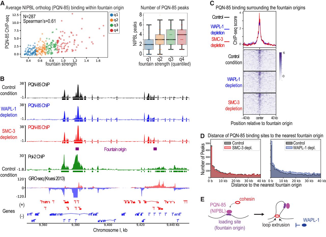 PQN-85 correlates with fountain strength, and its binding remains unchanged upon SMC-3 and WAPL-1 depletion. (A, left) Scatterplot of fountain strength versus mean PQN-85 ChIP-seq enrichment in control condition. Fountains divided into quartiles based on their strength are shown in different colors. (Right) Boxplot of fountain strength (divided into quantiles) and the number of PQN-85 summits within 6 kb region. (B) Genome browser view around fountain origins. Plotted are the input-subtracted ChIP-seq tracks for PQN-85 in three conditions: control (black), WAPL-1 depletion (blue), and SMC-3 depletion (red). The ticks below signal tracks indicate MACS2 called peaks. Fountain origins are shown in purple. (C) Average profile and heatmap of PQN-85 with respect to fountain origins. Plotted are the input-subtracted ChIP-seq tracks for cohesin subunits, SMC-3 and SMC-1, in three conditions: control (black), WAPL-1 depletion (blue), and SMC-3 depletion (red). (D) Histogram of the distance between PQN-85 summit and the nearest fountain origin. The three conditions are control (gray), WAPL-1 depletion (blue), and SMC-3 depletion (red). (E) Cartoon model of cohesin moving away from fountain origins without PQN-85 as it performs two-sided loop extrusion.