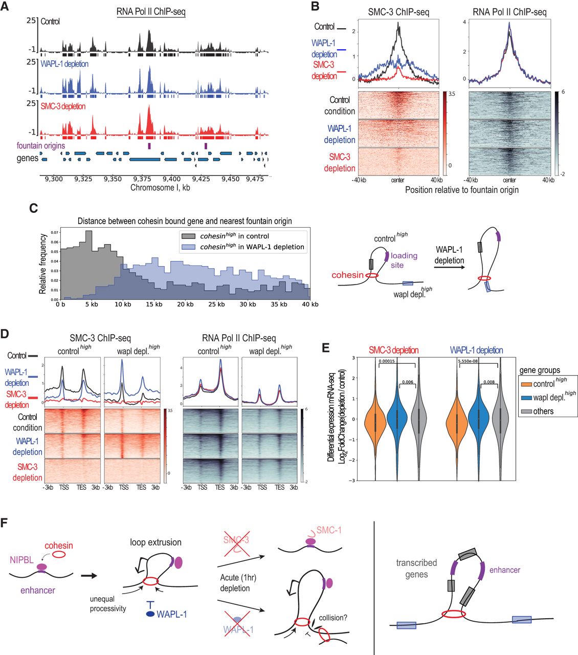 One-hour depletion of SMC-3 or WAPL-1 does not lead to drastic changes in RNA Pol II binding. (A) Genome browser view around fountain origins. Plotted are the input-subtracted ChIP-seq tracks for Pol II in three conditions: control (black), WAPL-1 depletion (blue), and SMC-3 depletion (red). The ticks below the signal tracks indicate MACS2-called peaks. Fountain origins are shown in purple. (B) Average profile and heatmap of SMC-3 and Pol II binding with respect to fountain origins. Plotted are the input-subtracted ChIP-seq tracks SMC-3 and Pol II in three conditions: control (black), WAPL-1 depletion (blue), and SMC-3 depletion (red). (C) Gene annotations from ce10 refGenes are categorized into cohesin high in control condition (gray) or in WAPL-1-depletion condition (blue), and their relative positions are plotted as a histogram from the nearest fountain origin. The two groups are mutually exclusive. The cartoon highlights that genes with higher cohesin binding in control are closer to fountain origins than genes with higher cohesin binding in WAPL-1-depletion condition. (D) Average profile and heatmap of SMC-3 and Pol II binding with over two groups of genes shown in C. Plotted are the input-subtracted ChIP-seq tracks SMC-3 and Pol II in three conditions: control (black), WAPL-1 depletion (blue), and SMC-3 depletion (red). (E) Differential mRNA-seq expression values (log2fc from DESeq2) are plotted for control high (n = 817), WAPL-1 high (n = 1268) genes that were further subsetted to be within 40 kb from the fountain origin, where the differential cohesin binding is the most pronounced. Other genes (n = 15,800) were used as control. Mann–Whitney U-test was used to generate P-values. (F) The proposed model of cohesin loading and loop-extrusion events inferred from the perturbation experiments and literature. Activated enhancers are bound by the NIPBL homolog PQN-85, which increases the frequency of cohesin loading at these sites. After loading, cohesin extrudes DNA in an effectively two-sided manner. Note that despite being depicted as a singular ring, the data cannot distinguish how many cohesin complexes are at the base of the loop. Upon acute depletion of SMC-3, the binding of PQN-85 is unaffected, and a residual amount of SMC-1 is found at loading site. The extruded loop is abolished. Upon acute depletion of the negative regulator WAPL-1, cohesin further extrudes DNA in two-sided manner away from the jet origin. The extended extrusion revealed that a clash between incoming and outgoing cohesin molecules may stall extrusion. Together, cohesin processivity at each side can be unequal and may be facilitated by transcription moving in the same direction. Despite the lack of immediate effect on transcription upon acute SMC-3 and WAPL-1 depletion, the extruded DNA loops encompass multiple cis-regulatory elements and active genes.