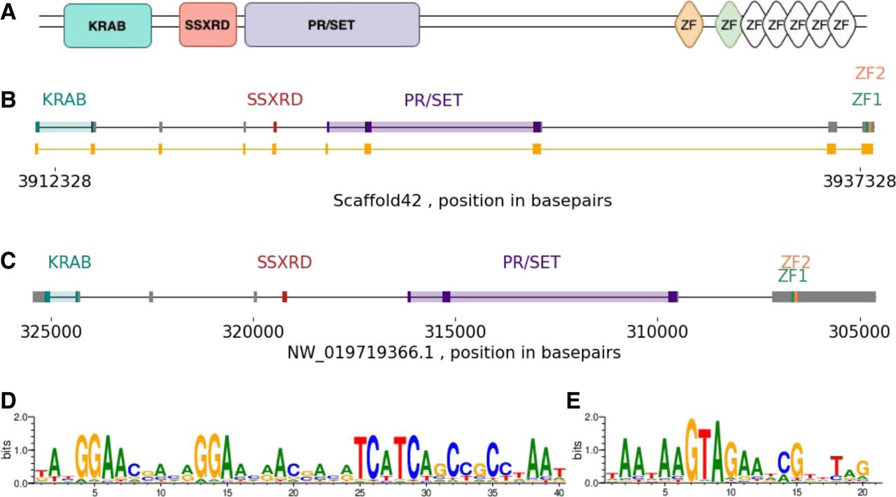 PRMD9 structure and predicted zinc-finger motifs in the M. bellicosus and C. secundus genomes. (A) Predicted structure of the PRDM9 protein sequence in C. secundus. (B) Predicted structure of the PRDM9 gene in M. bellicosus identified by homology searches. Exons and conserved functional domains are marked. The mapped exons from Zootermopsis nevadensis are also shown. (C) Structure of PRDM9 gene in C. secundus. Exons and conserved functional domains are marked. (D) Predicted zinc-finger binding motif in M. bellicosus. (E) Predicted zinc-finger binding motif in C. secundus.