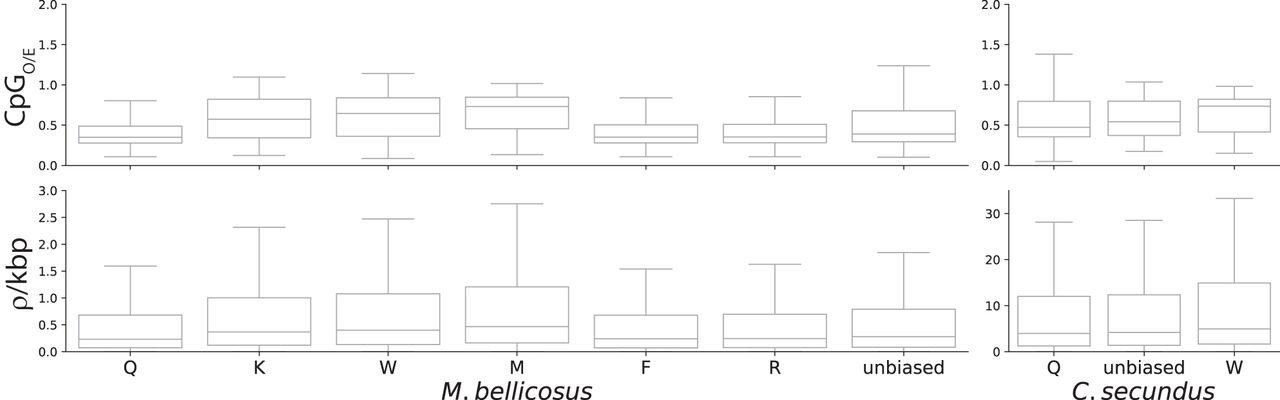 Boxplots showing variation in levels of CpGO/E and recombination rate (ρ/kbp) in the coding region of genes in the M. bellicosus and C. secundus genomes classified according to their patterns of gene expression: (Q) queen-biased, (K) king-biased, (W) worker-biased, (F) female-biased, and (R) reproductive-biased.