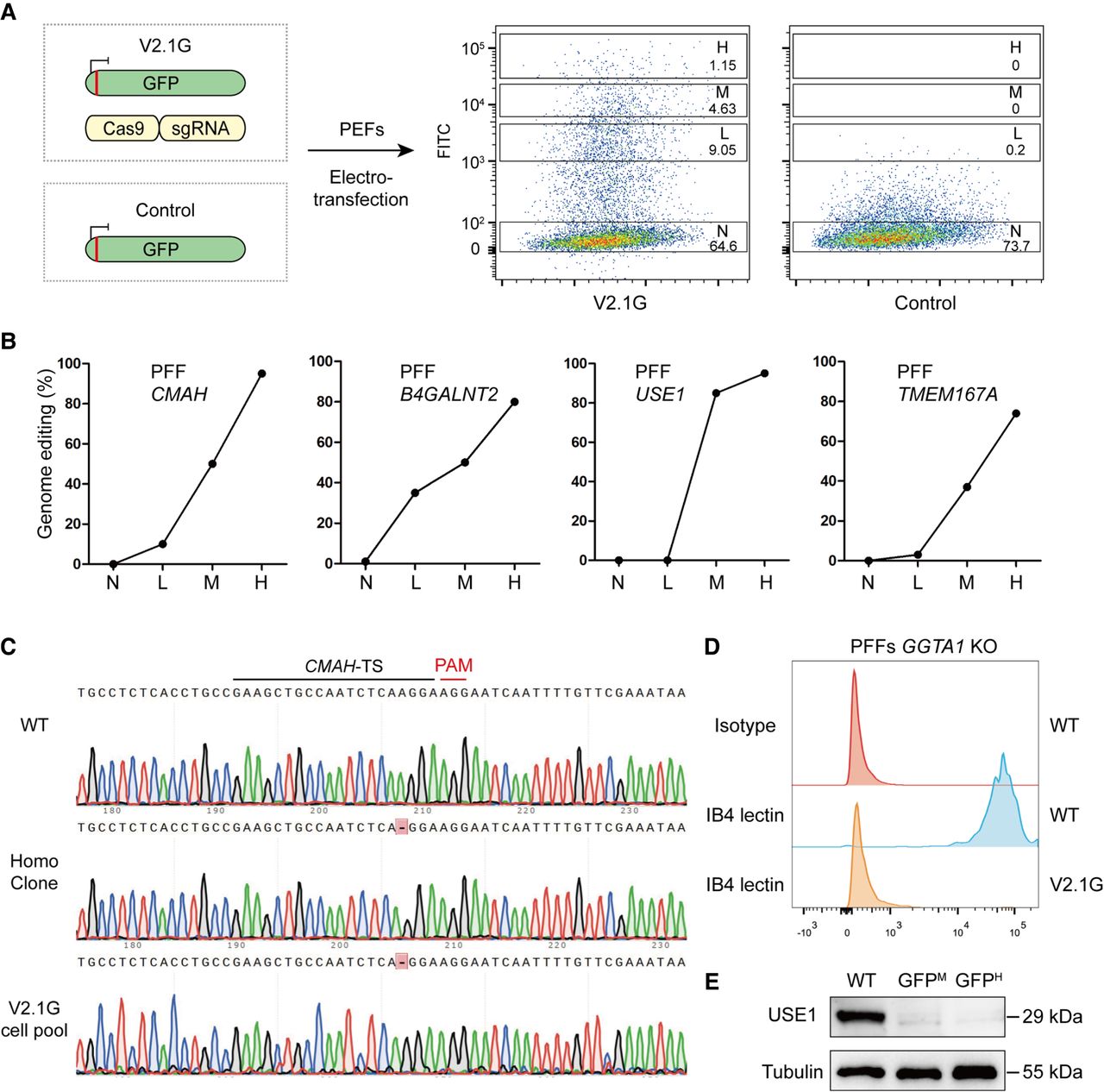 Selection of homozygously edited cells based on highest surrogate reporter expression. (A) Schematic of selection strategy using version 2.1-eGFP (V2.1G), a nonintegrated surrogate reporter system. PFFs were cotransfected with V2.1G, Cas9, and sgRNA plasmid, whereas the control group was only transfected with the V2.1G plasmid. FACS analysis revealed varying intensities of FITC expression among the cells. (H) The highest FITC intensity population, (M) the middle FITC intensity population, (L) the lower FITC intensity population, and (N) the negative FITC intensity population. (B) Correlation between genome editing efficiency and FITC intensity of endogenous targeting in PFFs. (C) Representative Sanger sequences of CMAH target site in wild-type cells, homozygous cell clones, and cell pools selected by V2.1G. (D) FACS analysis of GGTA1 targeting in PFF pools detection by IB4 lectin staining. (E) Western blot analysis of USE1-targeted Vero E6 cell pools with middle and high FITC intensity, respectively.