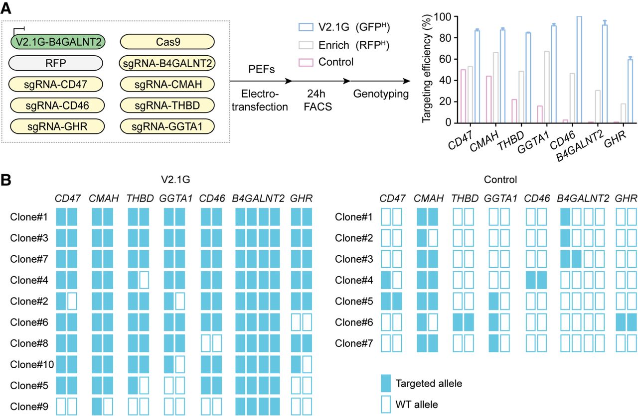 Simultaneous targeting of seven genes using V2.1G. (A) Schematic for targeting seven endogenous genes in PFFs using V2.1G. A surrogate reporter (eGFP) plasmid is used for selecting B4GALNT2-targeting cells. After 24 h of transfection, cells were sorted into three groups: V2.1G (FITC-highest), Enrich (PE-highest), and Control (PE-positive), for genotyping and colony formation. (B) Genotyping of the clones for seven genes at 16 alleles. Each box represents one allele, filled boxes represent a targeted allele, and empty boxes represent a nontargeted allele.