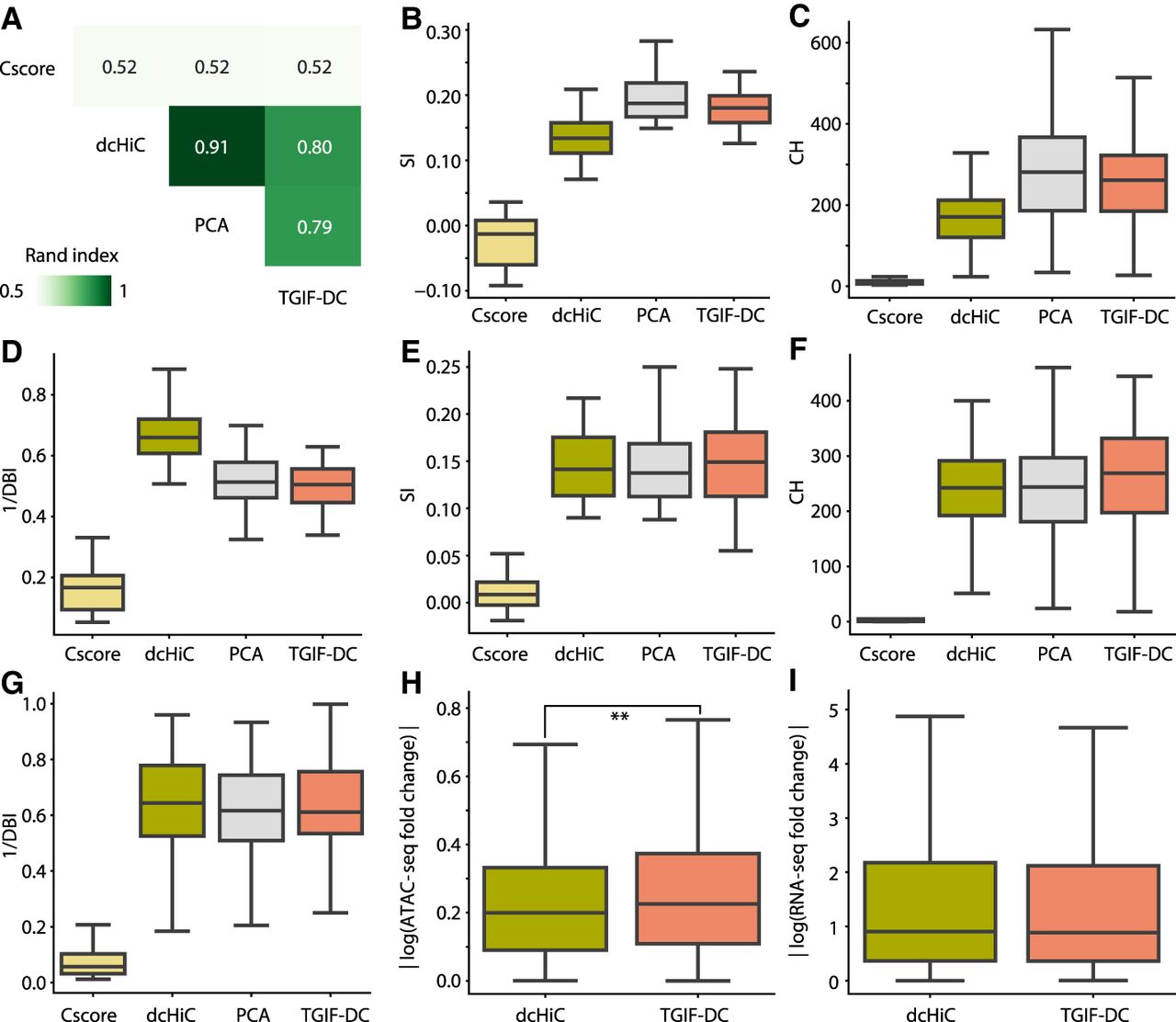 Benchmarking TGIF-DC on data from H1 and H1 differentiated to definitive endoderm. (A) Similarity of compartment assignments from different methods measured by Rand index. (B–D) Quality of compartments based on O/E counts measured by the silhouette index (SI; B), Calinski–Harabasz score (CH; C), and Davies–Bouldin index (DBI; D). (E–G) SI (E), CH (F), and DBI (G) on accessibility (ATAC-seq) signal. (H) Magnitude of log fold change in accessibility between H1 and endoderm within sigDCs identified by dcHiC and TGIF-DC. (I) Magnitude of log fold change in gene expression between H1 and endoderm within sigDCs identified by dcHiC and TGIF-DC.