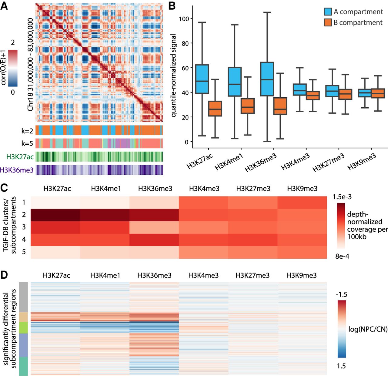 Characterizing compartments and subcompartments identified by TGIF-DC in mouse neural differentiation data. (A) A heatmap visualization of correlation matrix of O/E counts from cortical neuron (CN) Chr 18 regions at 100 kb resolution, followed by TGIF compartment assignments (i.e., clusters from k = 2) and subcompartments (e.g., clusters from k = 5), as well as H3K27ac/H3K36me3 ChIP-seq signal heatmaps. (B) Distribution of histone modification signal in A and B compartments in neural progenitors (NPCs) and CNs. (C) Mean histone modification signals across different subcompartments in NPCs and CNs. (D) Log fold change of histone modification signals between NPCs and CNs within significantly differential subcompartment regions identified by TGIF-DC. These regions were grouped based on their histone modification signal fold change patterns using k-means clustering and are visualized here.
