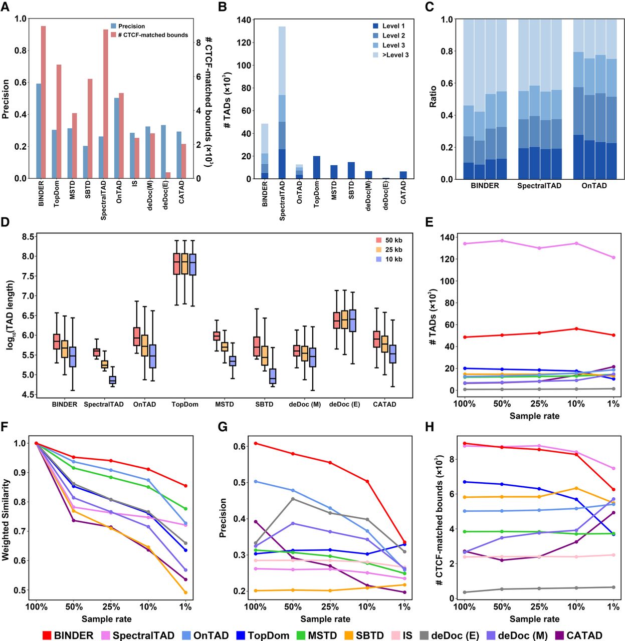Performance comparison between BINDER and other TAD callers. (A) Precision and the number of CTCF-matched boundaries on 10 kb GM12878 data. (B) Numbers of nested or nonnested TADs identified by BINDER and the other TAD callers. (C) Proportion of TADs of different levels identified by BINDER, SpectralTAD, and OnTAD (four bars of each TAD caller from left to right, representing the results on 10 kb GM12878, K562, NHEK, and HMEC data, respectively). (D) Lengths of TADs identified by BINDER and the others compared TAD callers on GM12878 data at resolutions of 50 kb, 25 kb, and 10 kb. (E–H) Number of TADs (E), weighted similarity (F), precision (G), and number of CTCF-matched TAD boundaries (H) on the whole-chromosome 10 kb GM12878 data at four downsampling rates.