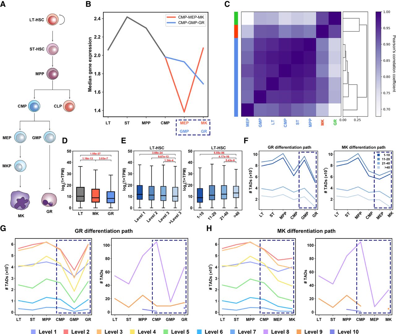 Hierarchical TADs illuminate a brand-new landscape of mouse hematopoiesis. (A) The well-studied differentiation tree of 10 mouse hematopoietic cell types. (B) Median gene expression of each cell type in both GR and MK path. (C) Hierarchical clustering of eight cell types in terms of active gene expression vector of each cell type, in which the three clusters are marked with different colors. The values of the heatmap represent the Pearson's correlation coefficients of active gene expression vector between two cell types. (D) Gene expression in TADs of greater than level 2 identified by BINDER in LT, MK, and GR (P-values, Wilcoxon rank-sum test). (E) Boxplots of gene expression (log2(1 + TPM)) within TADs of different levels and lengths (bin length) of LT-HSC, in which the expression value of a TAD is defined as the average nonzero expression value of all genes within it (P-values, Wilcoxon rank-sum test). (F) Number of TADs of different sizes of six cell types in GR (left) and MK (right) path. Number of TADs of different levels in GR (G) and MK path (H).