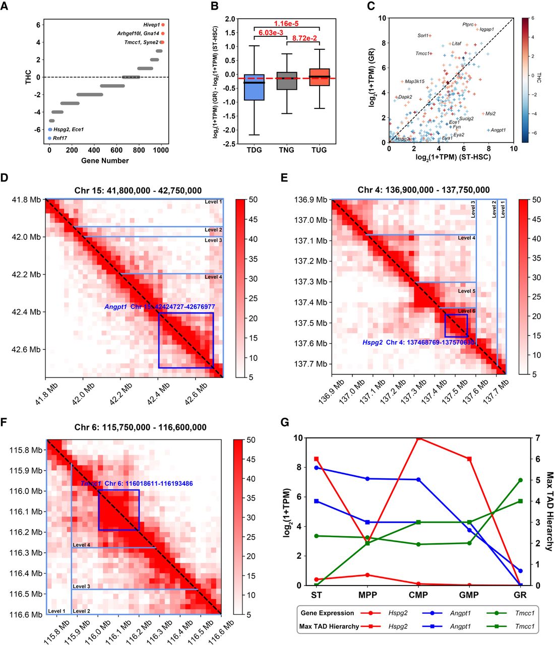 THC unveils genomic dynamics during cellular differentiation. (A) Distribution of THCs of 1013 eligible genes. Genes are sorted in ascending order according to their THCs, for genes with the same THC, we sorted them by string order of their gene names. (B) Boxplot illustrating gene expression variations for TDGs, TNGs, and TNGs between ST and GR (P-values: Wilcoxon rank-sum test). (C) Scatter plot showing gene expression of TUGs and TDGs in GR and ST, with color representing THCs (from low to high, ranging from blue to red). Some representative genes are labeled with their gene symbols. Hi-C submatrices near Angpt1 (D), Hspg2 (E), and Tmcc1 (F), with GR displayed below the diagonal and ST above. Dark blue boxes indicate the locations of genes, and light blue triangles represent hierarchical TADs. (G) Expression of Angpt1, Hspg2, and Tmcc1, along with their corresponding max TAD hierarchies in each cell type (max TAD hierarchy of a gene is defined as the largest level of all TADs containing that gene, and we say that max TAD hierarchy of a gene is zero if there is no TAD containing it) in the GR path.