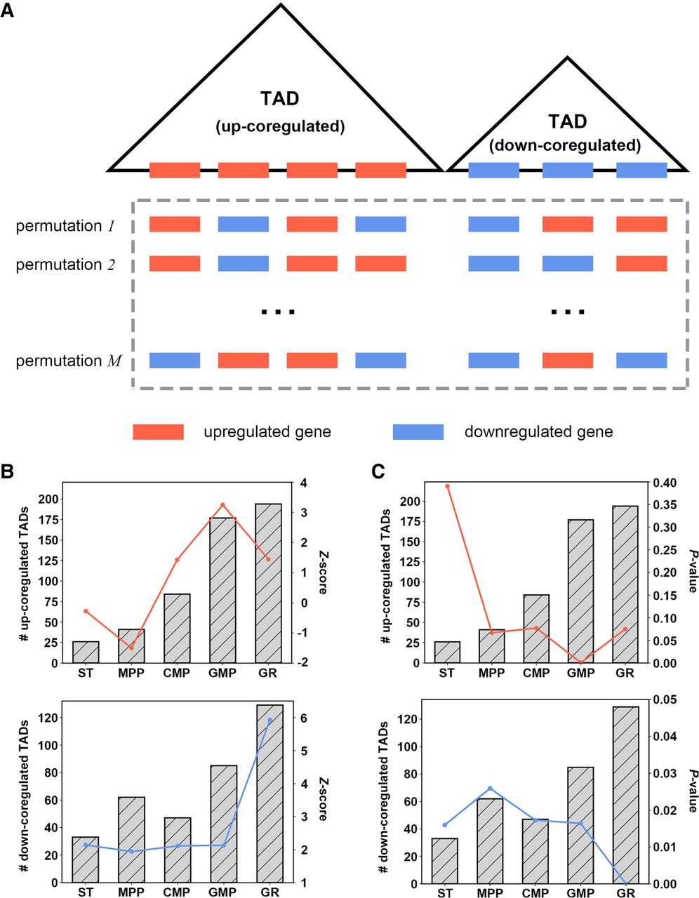 Contribution of hierarchical TADs in transcriptional coregulation. (A) Schematic of random genome permutation (for details, see Supplemental Methods) and up(down)-coregulated TADs. Barplot of the number of up(down)-coregulated TADs and lineplot of the corresponding Z-scores (B) and P-values (C) for each cell type in GR path.