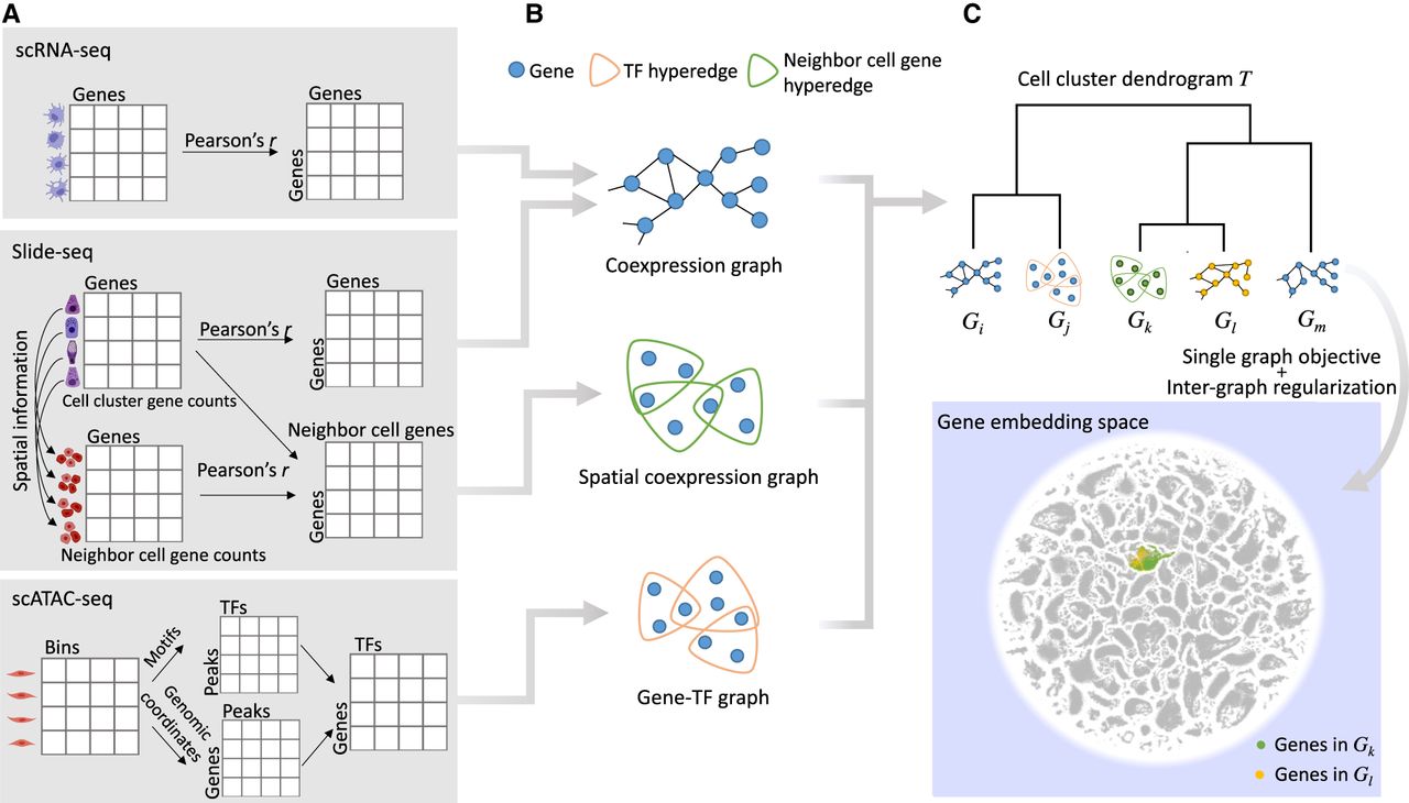 Schematic illustration of the method. (A) Cell clusters are identified from each tissue of each data modality. For each scRNA-seq cell cluster, a gene coexpression matrix is constructed for all the gene pairs in the cell cluster. For each Slide-seq cell cluster, the same gene coexpression matrix is also constructed, and another spatial coexpression matrix is built for gene pairs between the cells of this cell cluster and their neighboring cells. For each scATAC-seq cell cluster, identified peaks from the bin matrix are associated with TFs and genes, which forms a gene–TF matrix. (B) We obtain gene coexpression or coregulation graphs for each of these modalities based on the specific matrices computed in A. (C) A dendrogram for graphs in B is constructed by hierarchical clustering of cell clusters, and a multilayer graph learning algorithm is applied using the tree structure. Each gene in each graph is then encoded into an embedding space, where genes with similar functions are embedded together.