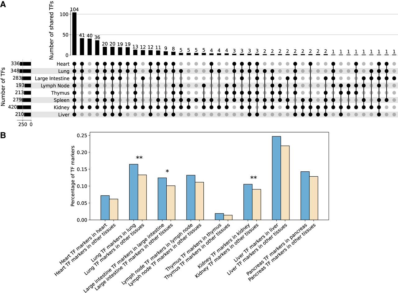 TFs discovered in different tissues. (A) TF intersections among different tissues. Bars on the left show the number of TFs identified in each tissue, and each bar on the top shows the number of TFs shared among tissues marked by the dots below it. Tissues with fewer than 20 TFs identified are omitted in this figure. The figure was drawn using UpSetR (Conway et al. 2017). (B) The percentage of tissue-specific TF markers in the corresponding tissue (blue) compared with their percentage in the other tissues (light yellow). Significant enrichment in blue groups: (*) P ≤ 0.05, (**) P ≤ 0.01; P-values are evaluated using one-sided Fisher's exact tests.