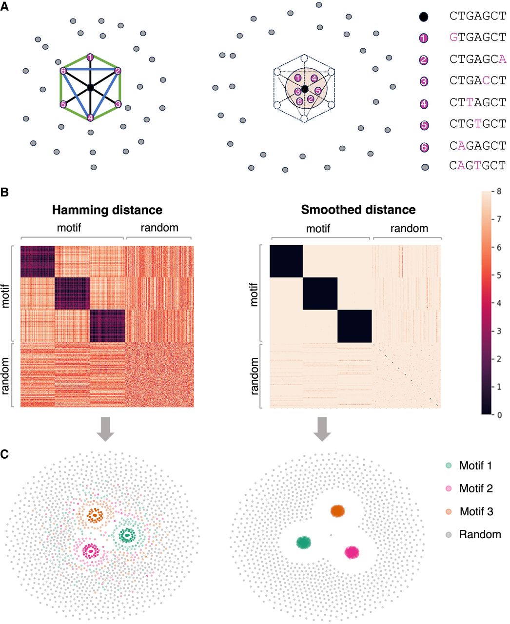 , and one for the diagonal (black line), semidiagonal (blue line), and adjacent k-mers (green line). The right panel shows the schematic effects of Hamming distance transformations (Equations 1, 2), in which motif k-mers are pulled closer and random k-mers are repulsed further. (B) Toy example. The left panel shows the Hamming distance matrix of a k-mer (k = 8) data set with three motifs, as highlighted by the black blocks. Within a motif, the Hamming distance ranges from zero